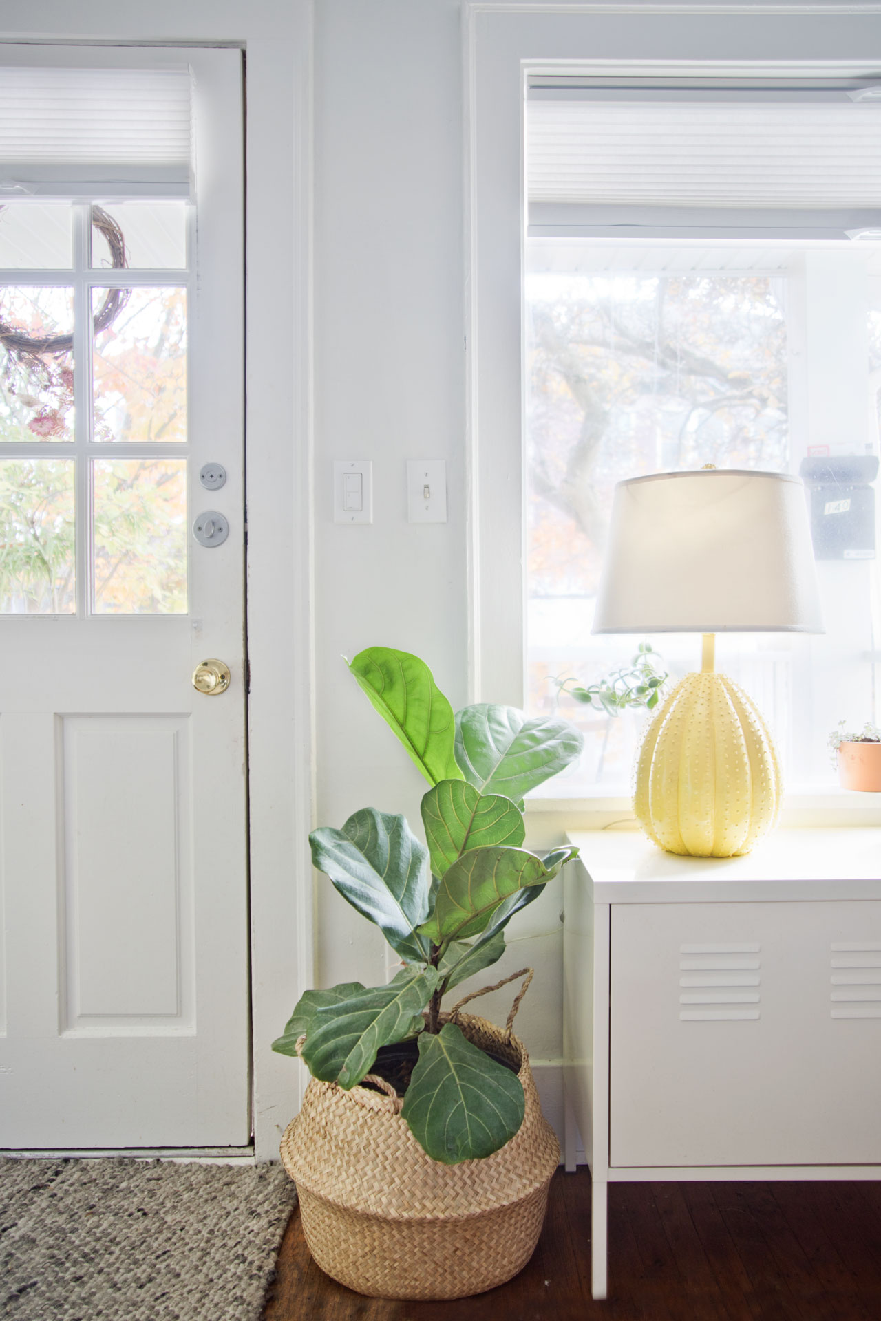 Moving on, one of our more recent finds is the yellow lamp in the photo below. We found it at Goodwill and it’s probably my favorite lamp I’ve ever owned. It has little raised dots on it and for some reason, it reminds me of a cactus.