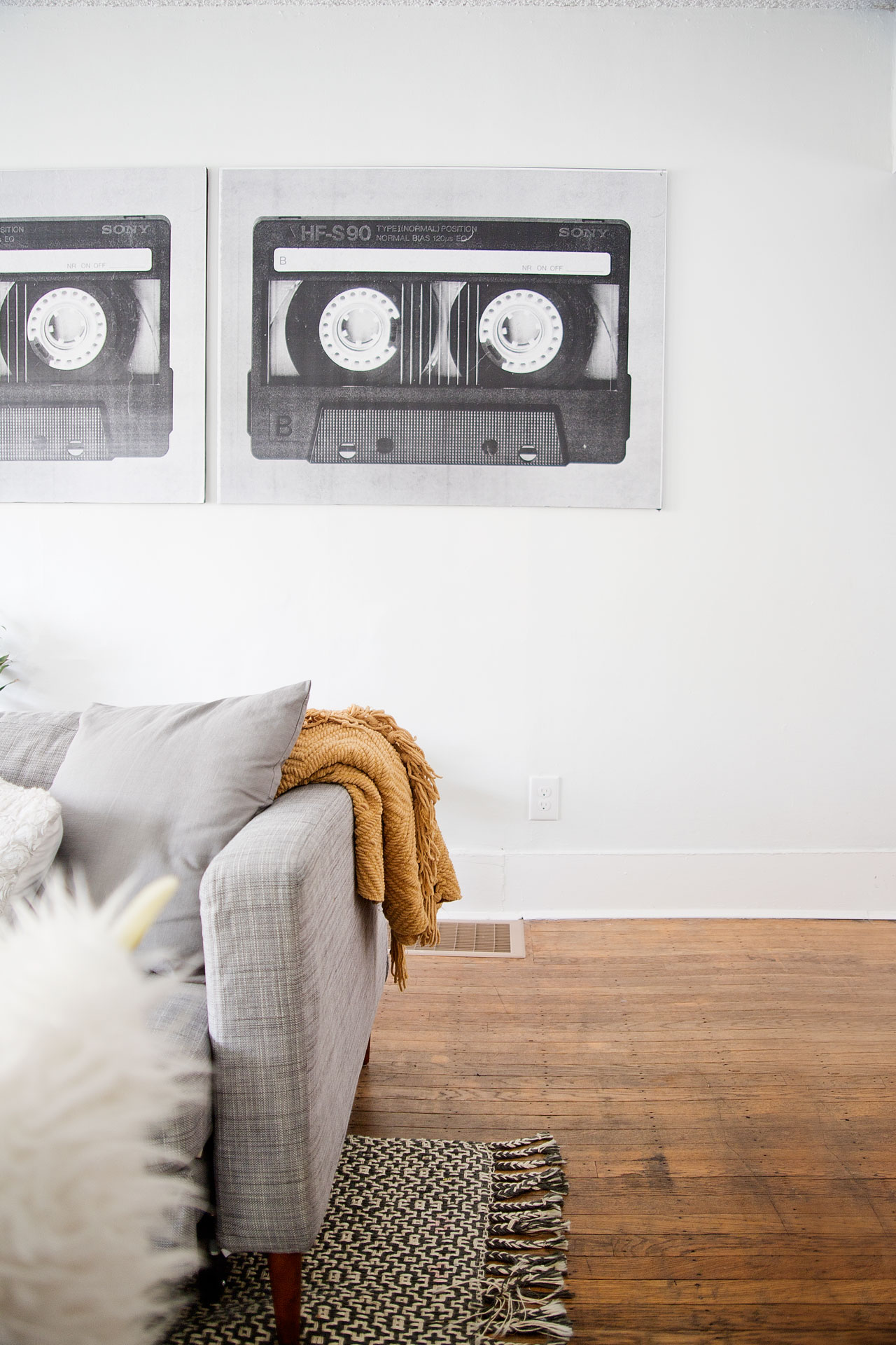 Let’s get started, shall we. In the photo below, there are two things I want to point out. There is a glimpse of our Ikea Karlstad Sofa, which we got on Craigslist years ago. We purchased a new slip cover and swapped out the legs to give it a fresh look and it basically looks brand new. But the real showstopper in this photo is the artwork. We have three of these prints hanging in our living room. They are engineering prints, which we mounted on foam boards. The foam boards were actually free. Someone left them in the lobby of our Condo when they moved out. Free second hand is the best kind of second hand, am I right?