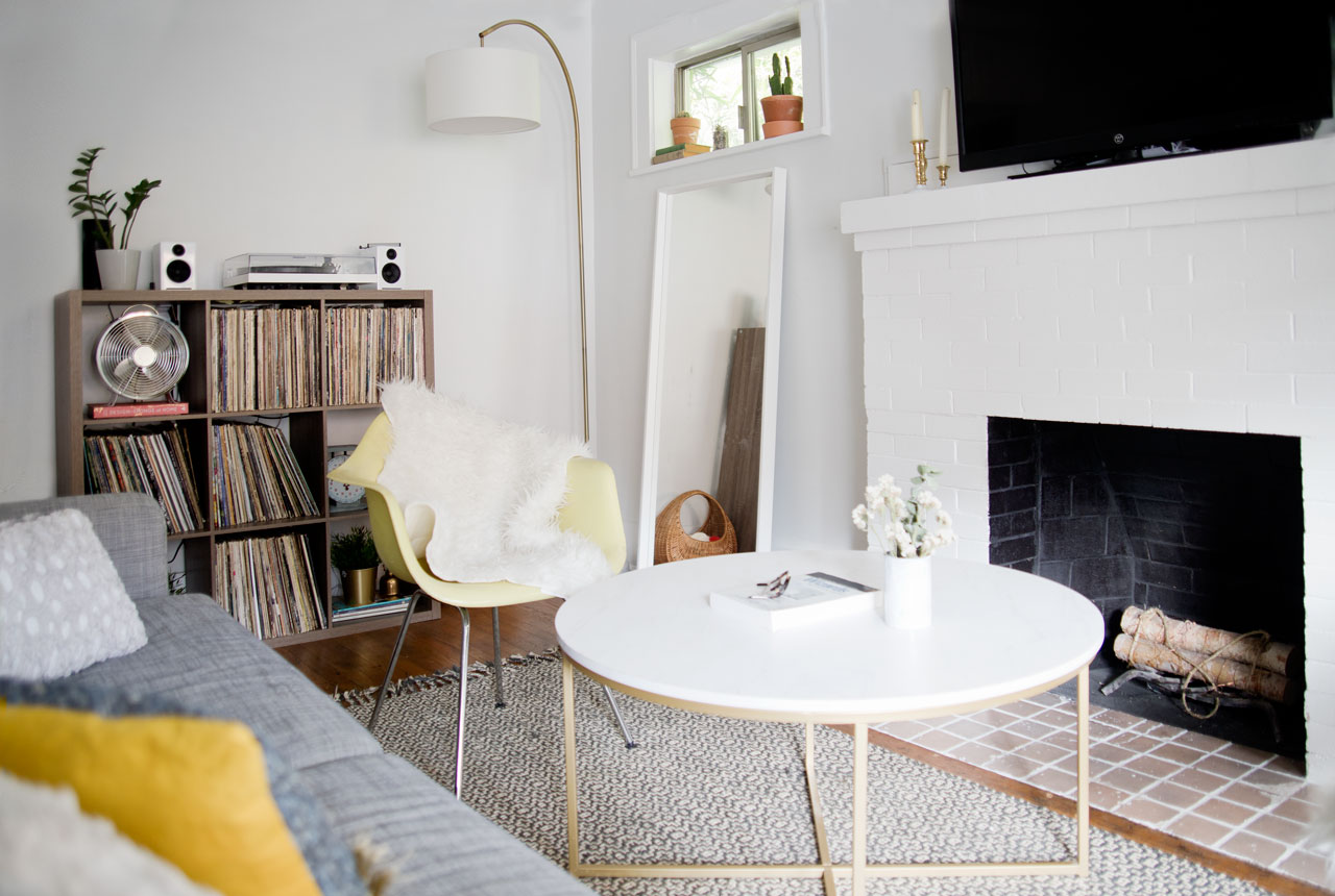 Our coffee table is also a relatively new Goodwill find. It’s faux marble and was a steal at less than $10. It’s actually for the best that it isn’t real marble because Florence has designated this as her “art table,” which means it’s always covered in crayon markings.ย In this photo, you might also notice one of the Eames chairs, which were my greatest Craigslist score of all time. If you ever wondered how to restore a pair of Eames chairs, definitely check out this post.