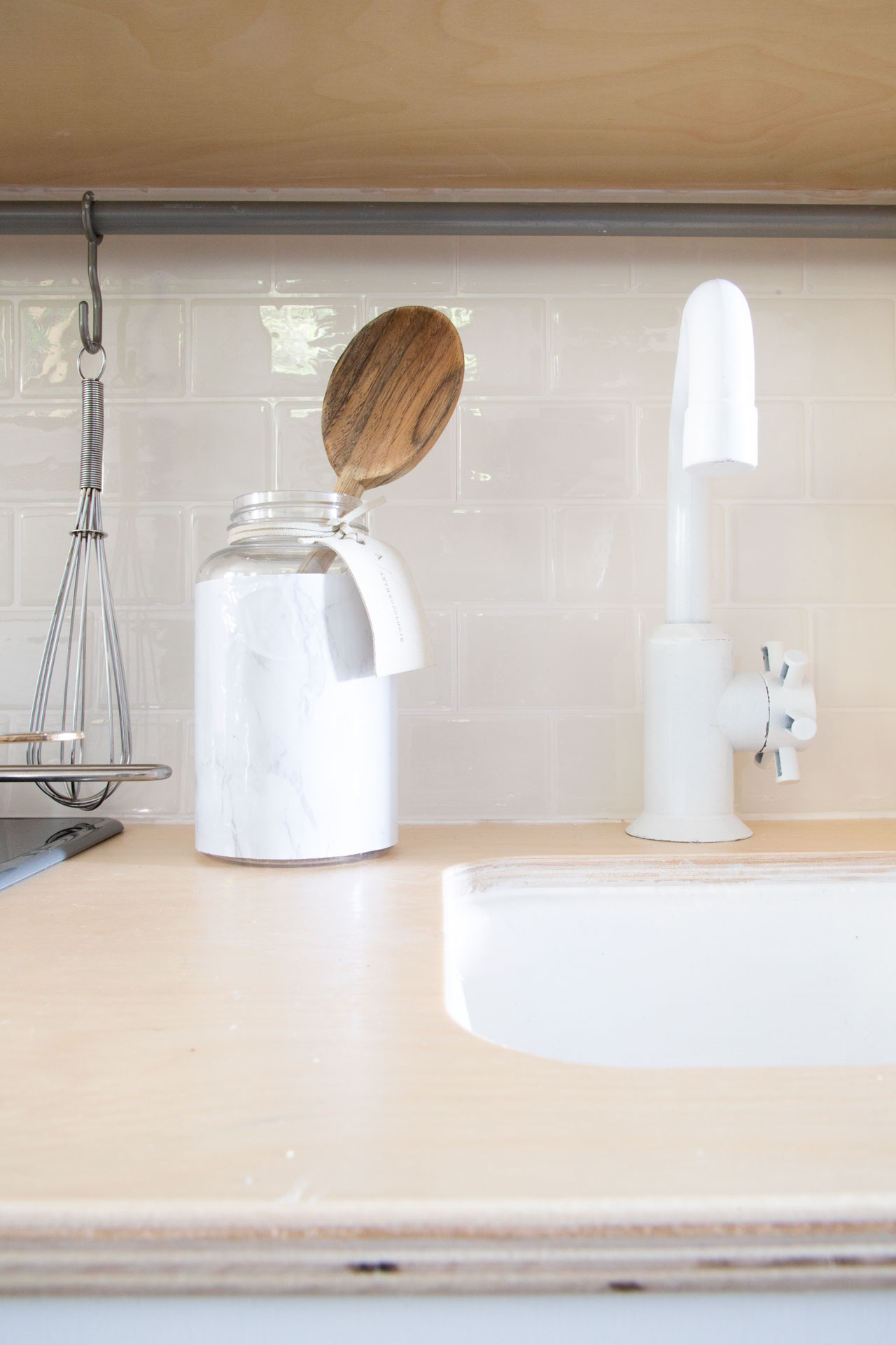 - As a final touch, I created a faux subway backsplash. This was fairly simple. I used peel and stick tile on a piece of foam board, which I cut to size. Then I used wood glue to affix it to the back of the kitchen.