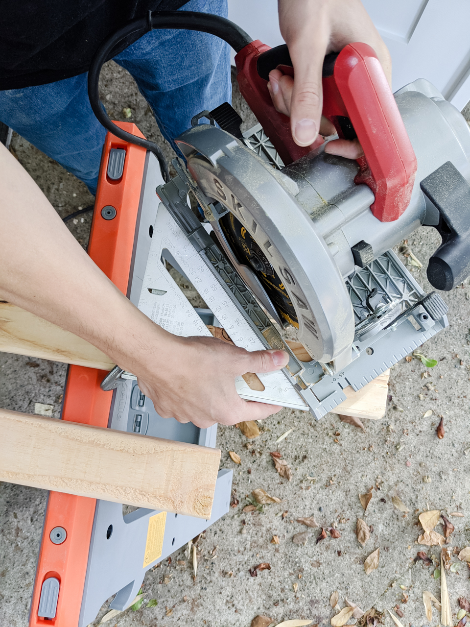 First we cut the wood to size. My dimensions are 50″ x 65″.ย Joey got fancy and did the corners by cutting 45 degree angles. He ensured that the point of each cut was the desired measurement.ย Then we used screws to build the frame.
