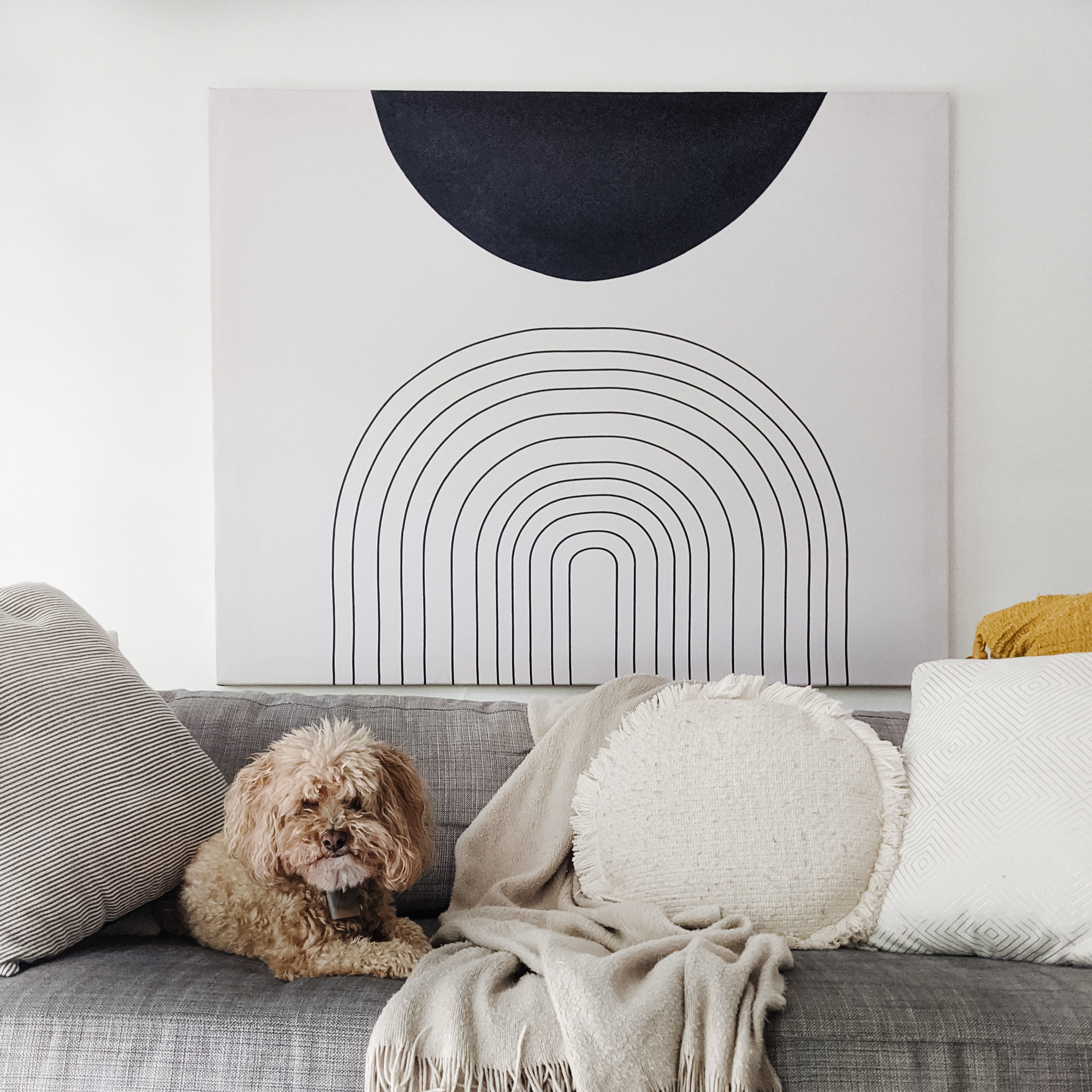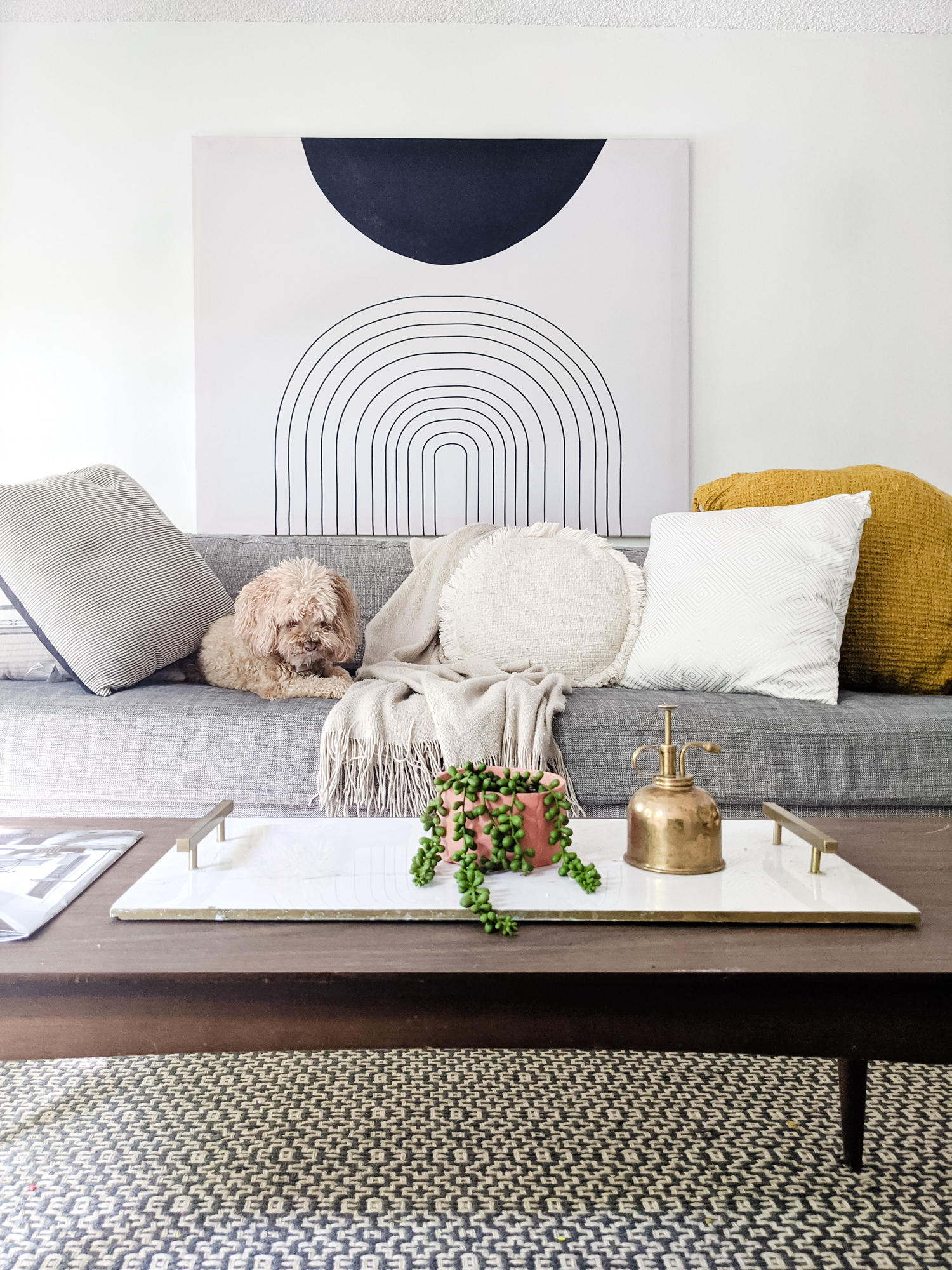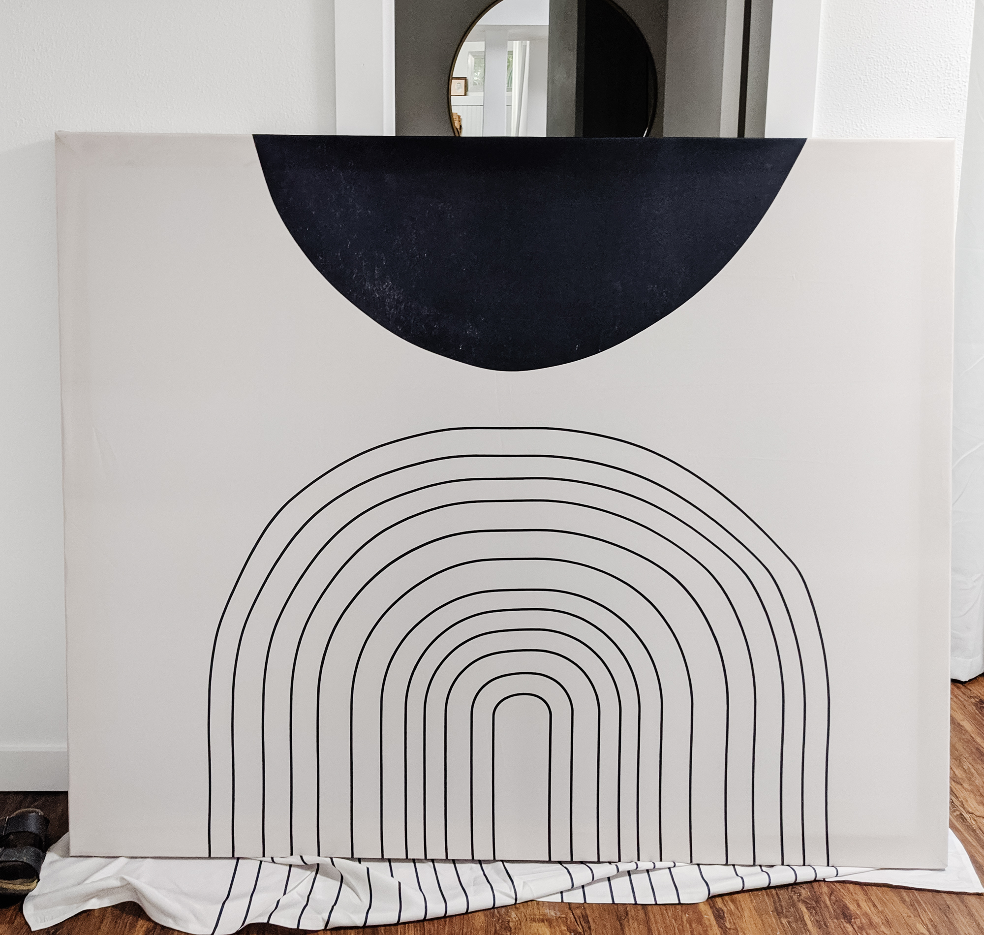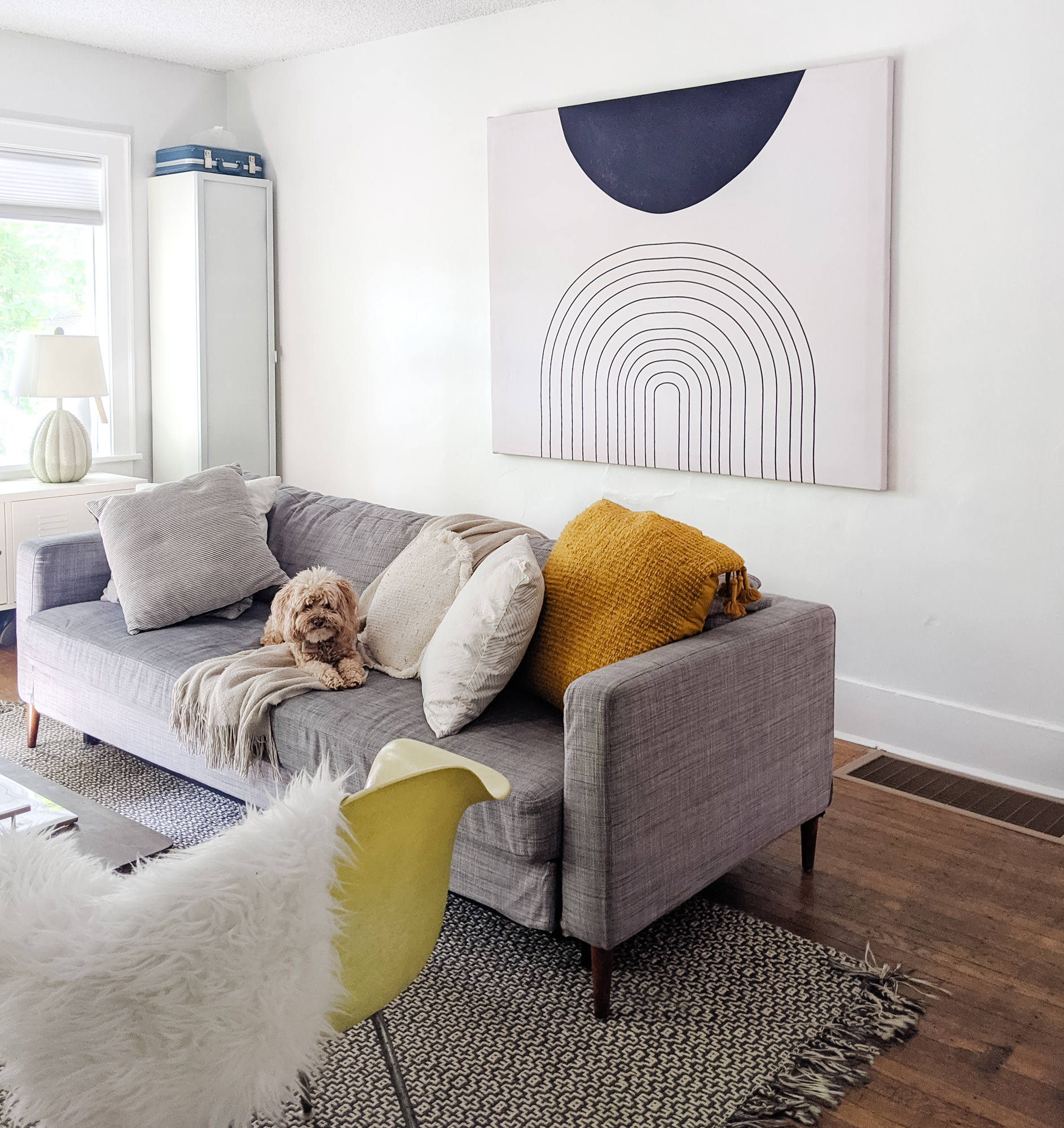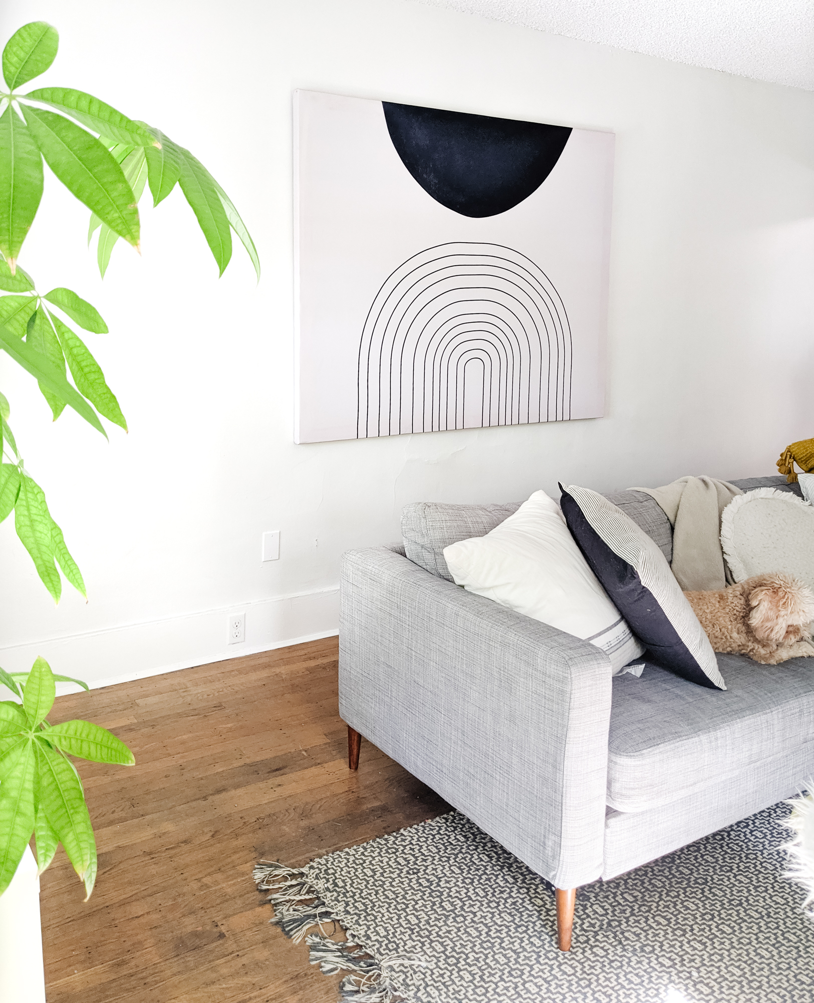 In my last post, I mentioned that I have been feeling like our living room is too busy. After a lot of deliberation, I concluded that part of the issue was the set of 3 huge cassette tape prints.ย I love how they looked, but it was just a bit too much.ย I wanted a more minimalist art piece, but I needed something huge for the scale of the wall.ย Luckily, some Pinterest digging helped me find Angela Rose Home’s shower curtain to wall art diy, and I knew that was the ticket to large, yet affordable art.ย So I found a shower curtain that I loved on Society6, some 2x4s, screws, a staple gun, our circular saw, and got to work.