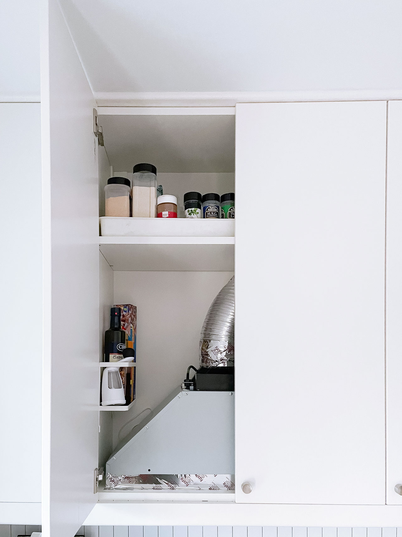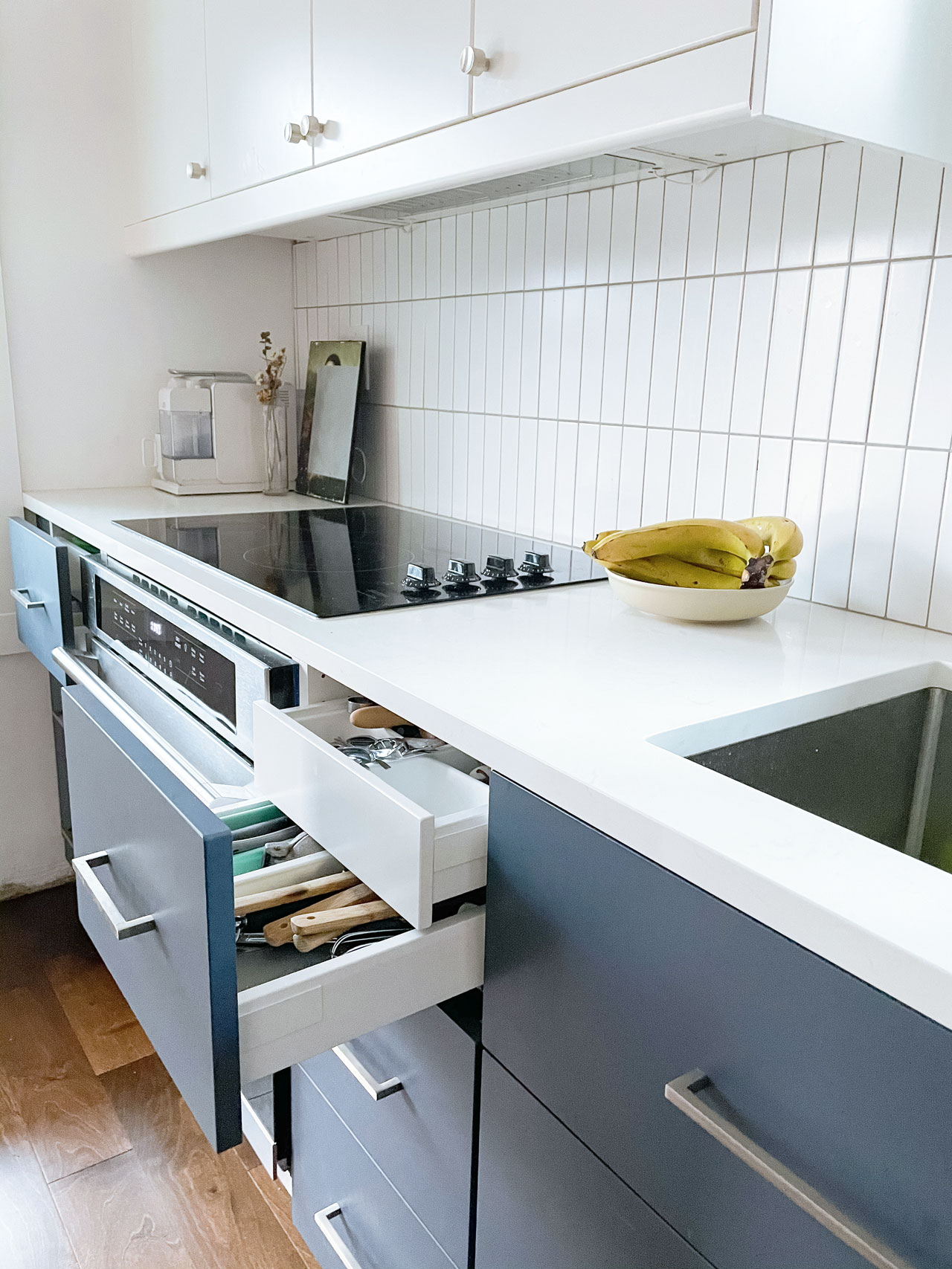 And although I love the look of a bold hood vent, we decided to keep with the integrated theme and install one hidden behind a cabinet.