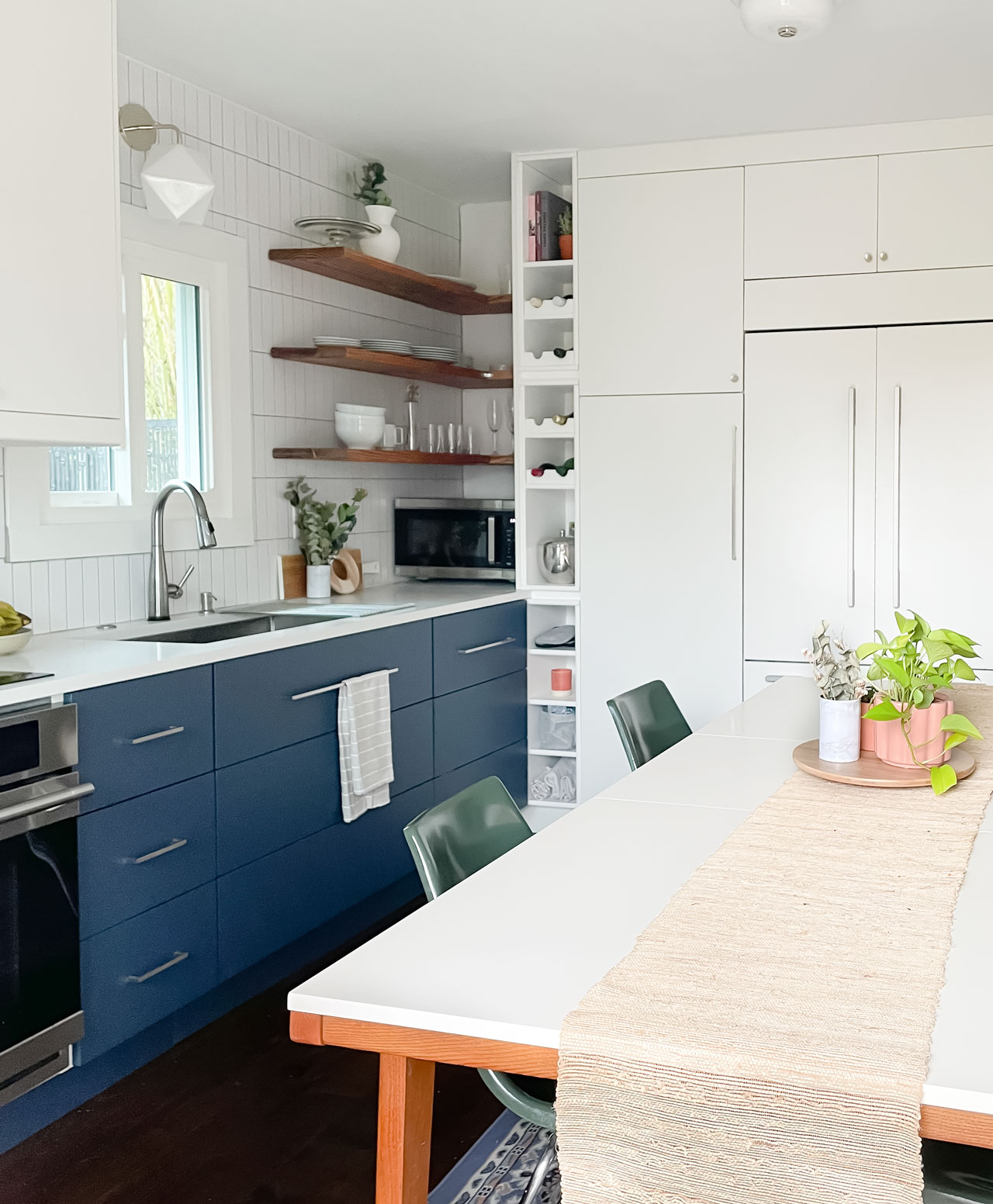 Unfortunately we don’t have a dining room, so we had to squeeze our table in. I decided to float it in the center of the room sort of like an island. It actually works out great because it does provide extra counter space when needed. And it doesn’t feel cramped, which was my major concern. We did all integrated appliances for a streamlined look. And I’m so glad we went that route. It looks much cleaner.