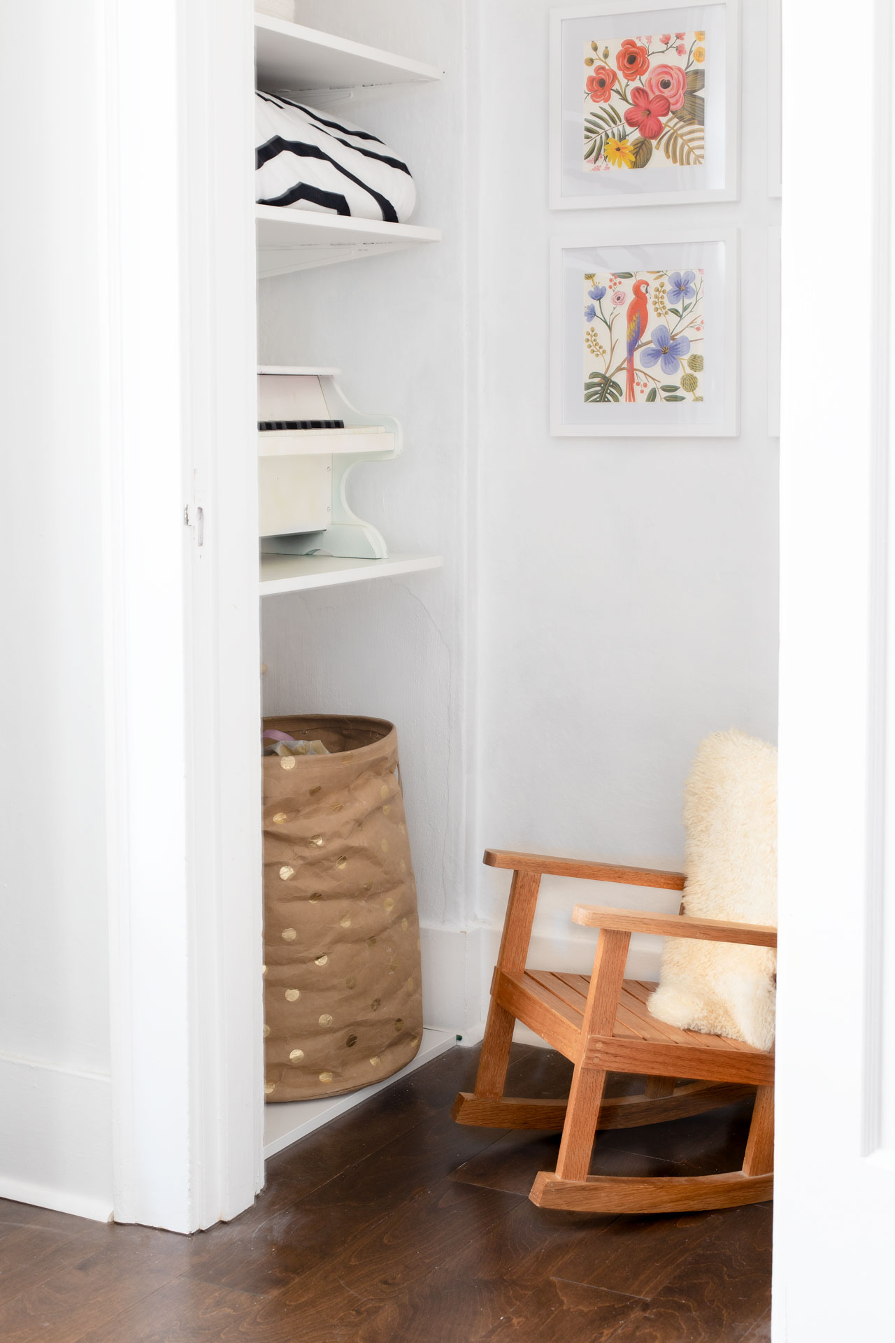 The toys she likes to use on a regular basis are on the bottom shelf where she can grab them. I put her rocking chair next to the toy basket so she can sit and go through her toys.ย Fun fact, that rocking chair was mine when I was a kid. My grandma gave it to me.