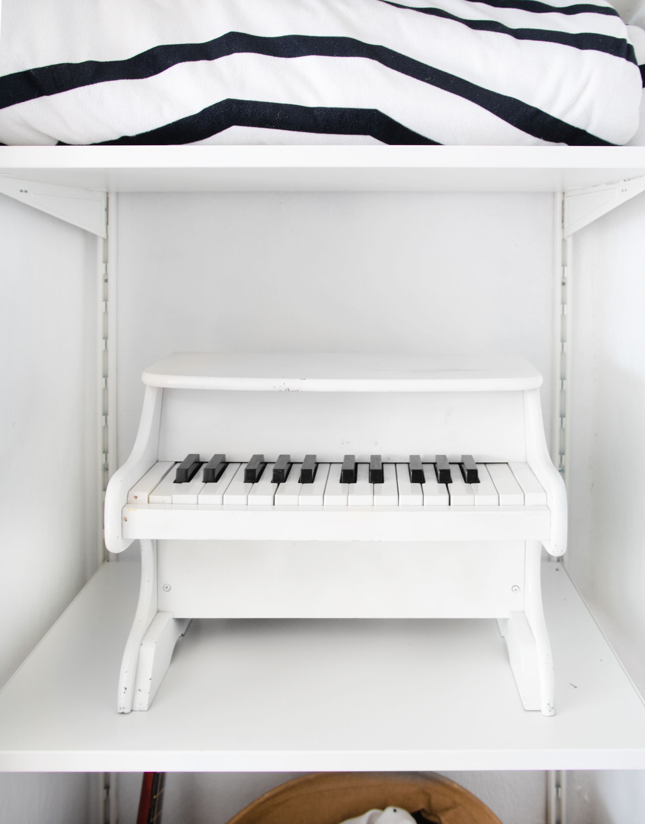 She likes to dress herself these days, so this is a good solution. On the other side of the closet, I installed the Boaxel Shelving unit from Ikea, which gave me tons of storage space. With all the new space, I was able to reorganized her toys. The toys she uses less often were put in a basket on a higher shelf that only I can reach. I put her little piano on the second shelf. It’s the perfect height for her to play while standing.