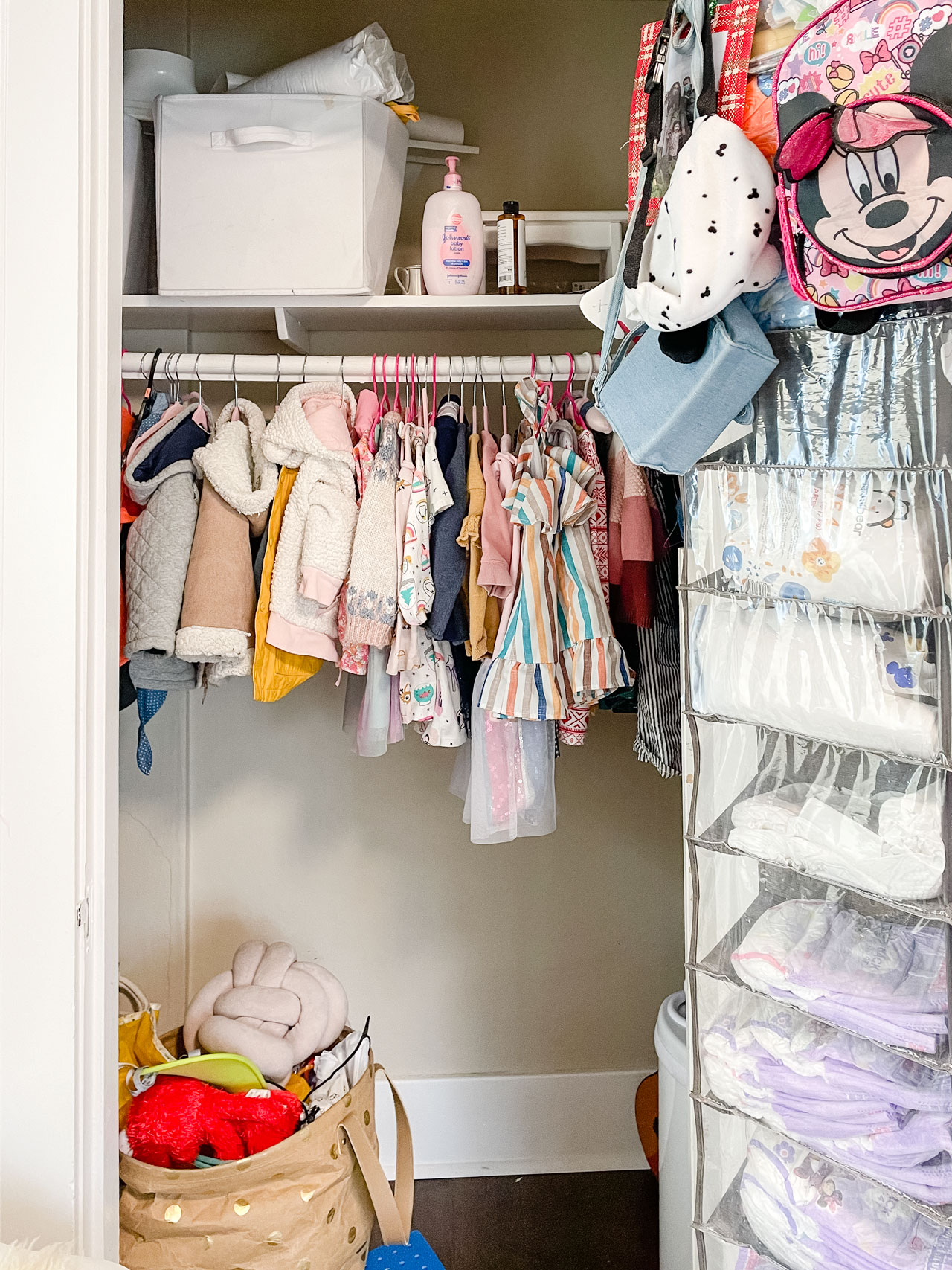 I’m super excited to share this makeover with you all! Before I get into it, some background. One of the things about our house that I truly hate is the size of the closets. They aren’t actually that small, but they are a super strange setup. They are probably the same width as a typical closet, but don’t have a sliding door. There is just one door in the center and there is a long rod spanning the full width, which means there is lots of hanging space, but you can’t actually walk into the closet and get anything. Things get shoved into the corner and are never seen again. It’s a real problem, and I’ve been wanting to rethink the layout for our closet for a while, but I hadn’t really got around to it. But then I saw an adorable kid’s closet makeover on Apartment Therapy and was totally inspired. I decided to first try a new layout in Florence’s room, before committing to an overhaul of our closet. And OMG it looks amazing. Here is the before.