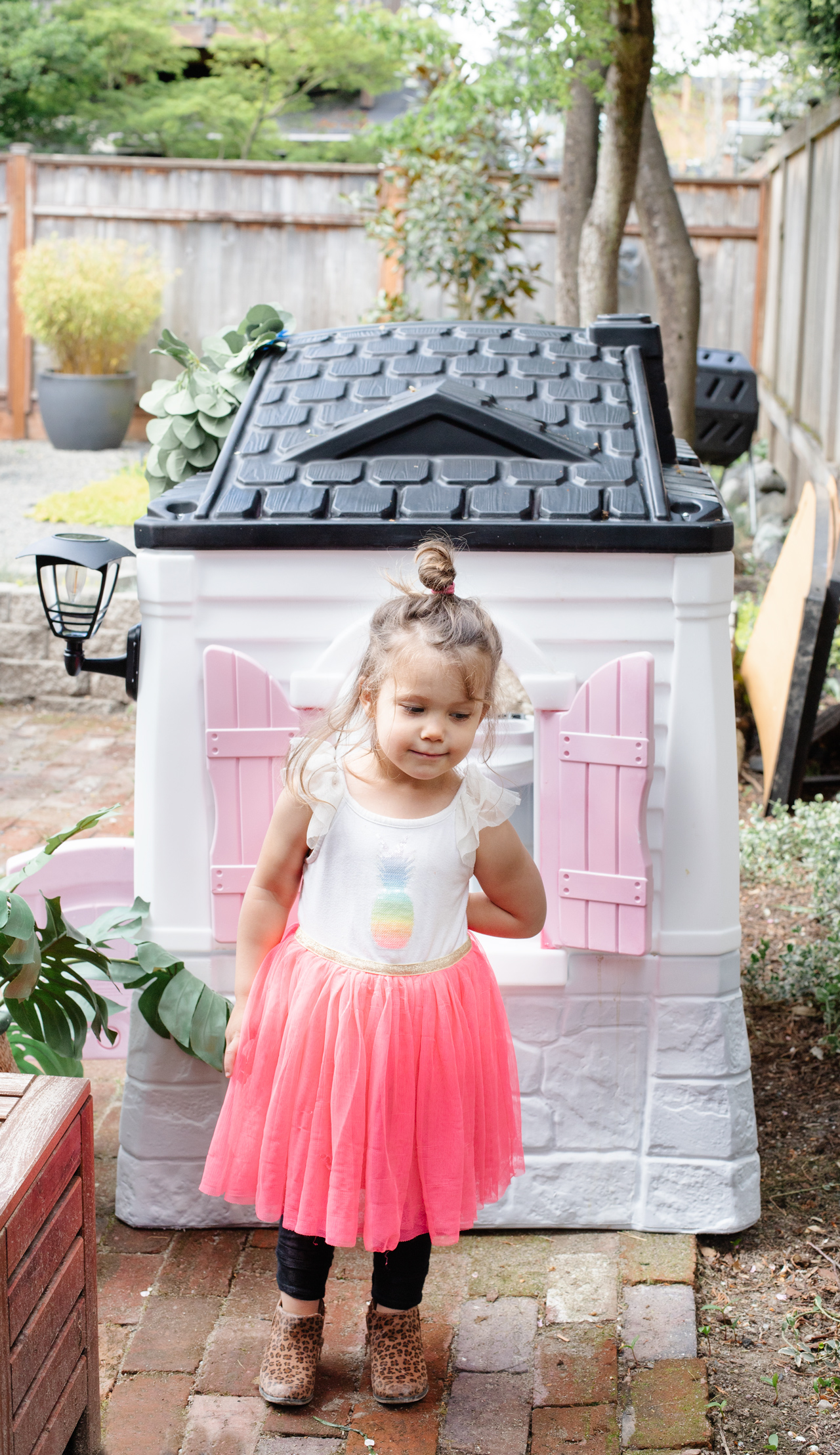 Before I talk about the process of transforming this, let me go on a side tangent. I think I’ve made it clear through other posts that I really, really hate most plastic toys. I honestly can’t explain why I hate them so much, but if I had to give a few reasons, I think it’s because they are usually super bright colors (not my preferred neutral tones) and they typically look cheap and disposable. Harsh, I know. But I really try to avoid buying plastic toys and will opt for wood when given the chance. However, Florence got a Step 2 plastic playhouse as a gift and after letting it sit in the garage for a few months, I decided to finally buck up and put it together. Okay, okay, okay, the truth is that my mom was visiting and guilted me into putting it together. She said I was more or less ruining Florence’s childhood with my obsession with aesthetically pleasing toys, which I think is a bit of an overstatement, but fine. I heard her loud and clear. I put it together, but wow, it was really ugly. Proof below.