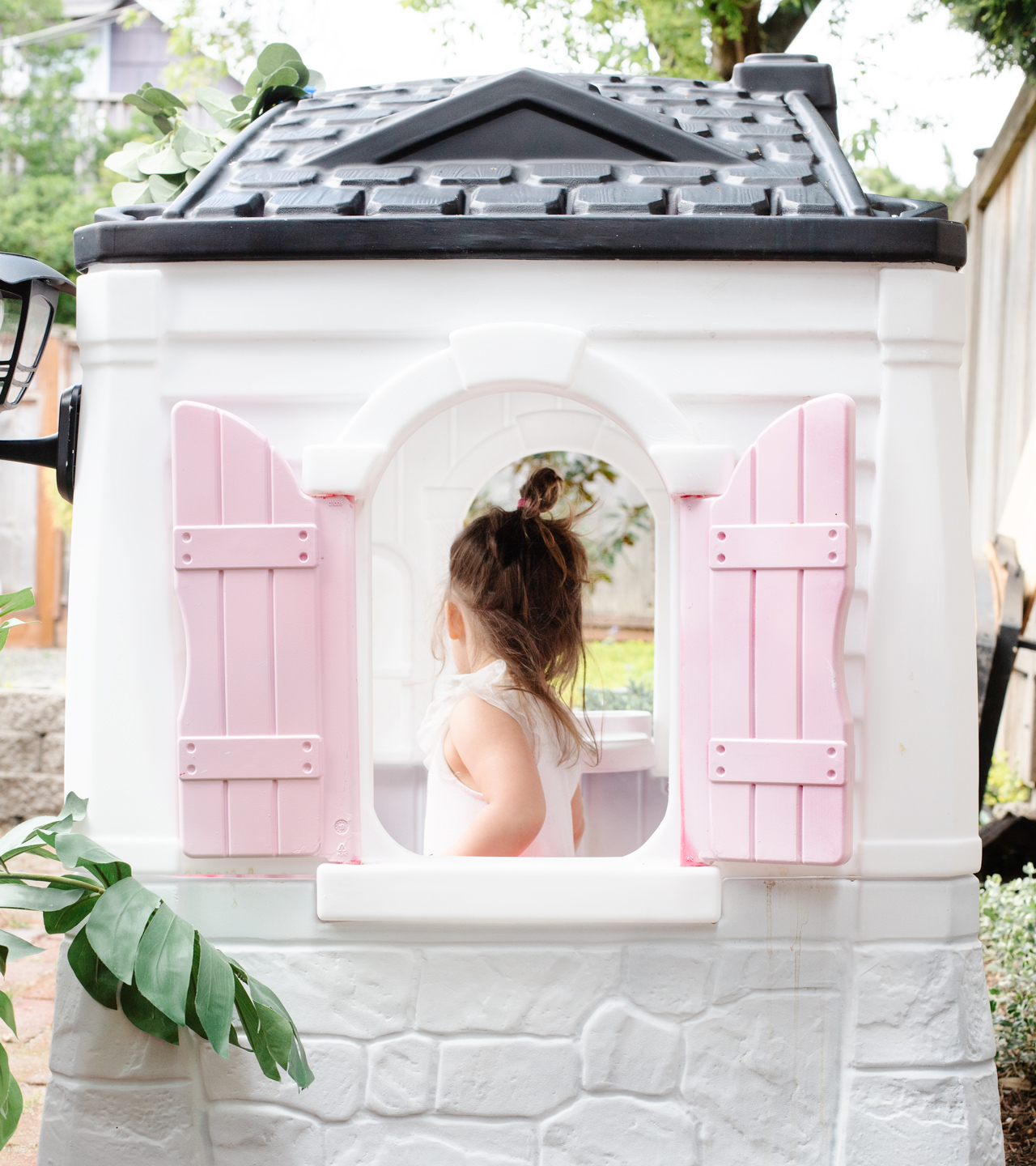 Florence loves it now, but originally, she was pretty pissed that I painted to roof black. Apparently, pink “looked better” in her mind, which I’m not going to even try to argue because arguing with a 3 year old is pointless. But because I’m not a total monster, I painted the shutters and front door a more muted pink to appease her need for color. See… I’m a totally reasonable mom… not a lunatic who denies her daughter color.