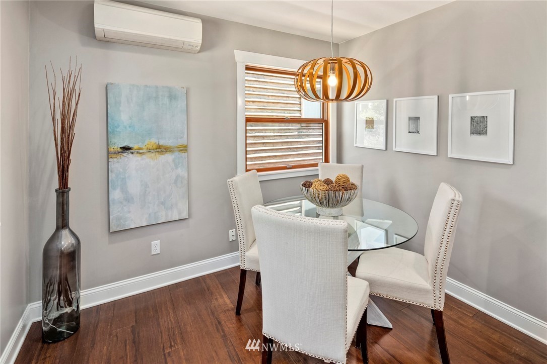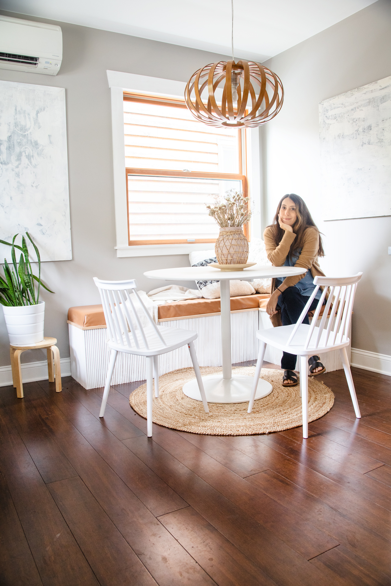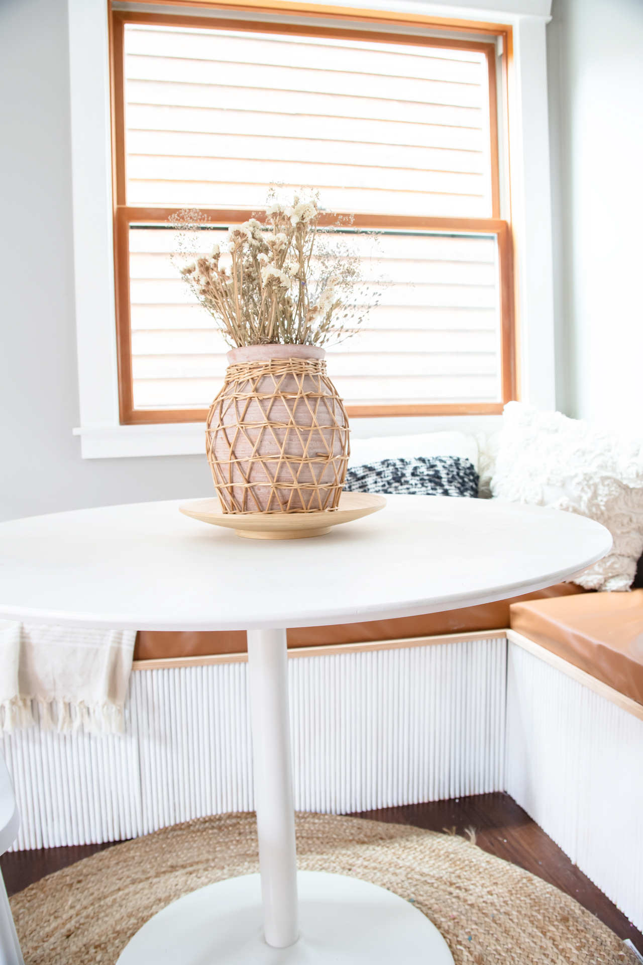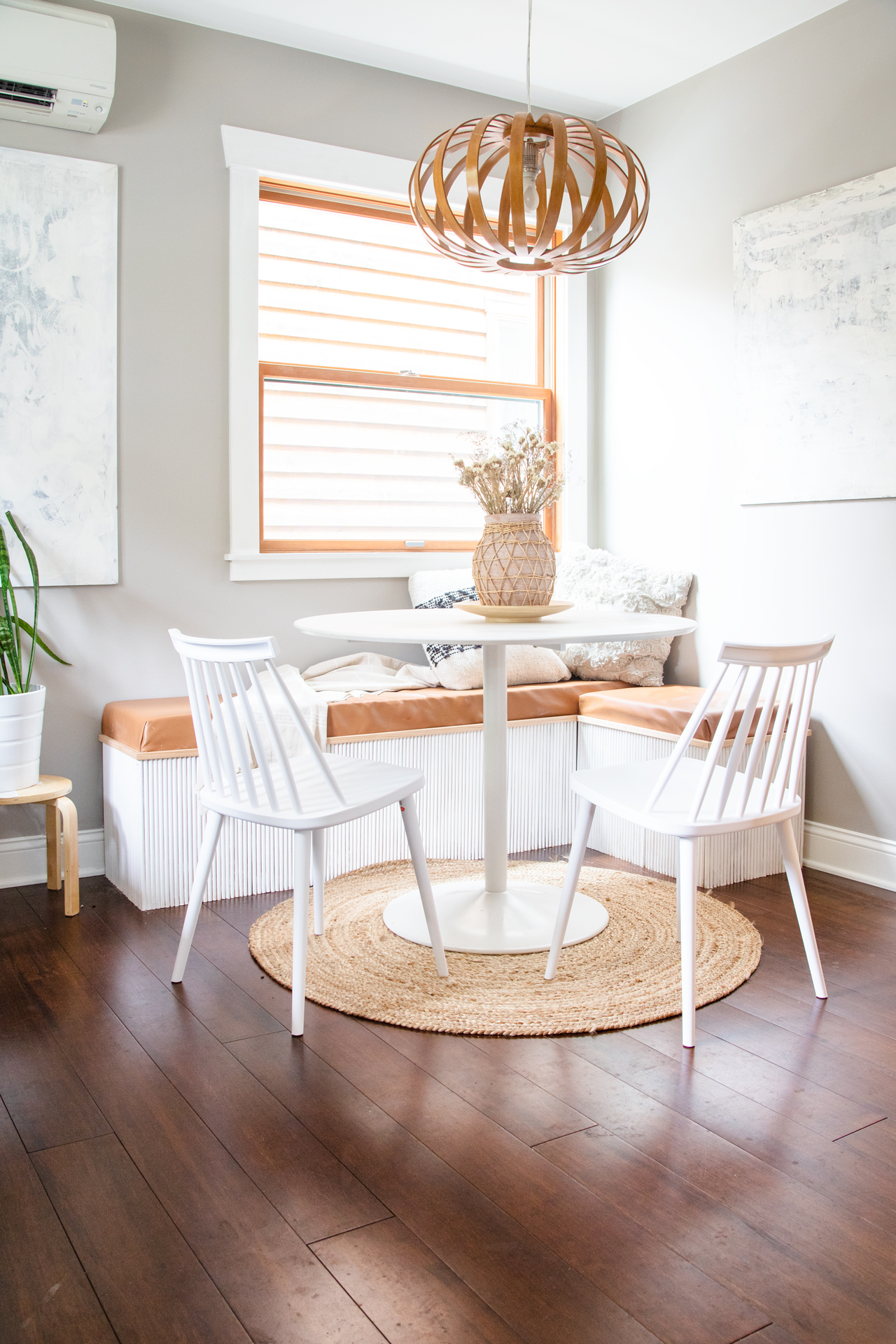 One of the first things I wanted to do was update the breakfast nook. Here is the before from the staging photos! Totally fine, but not my style at all. And I really wanted a built in banquette.