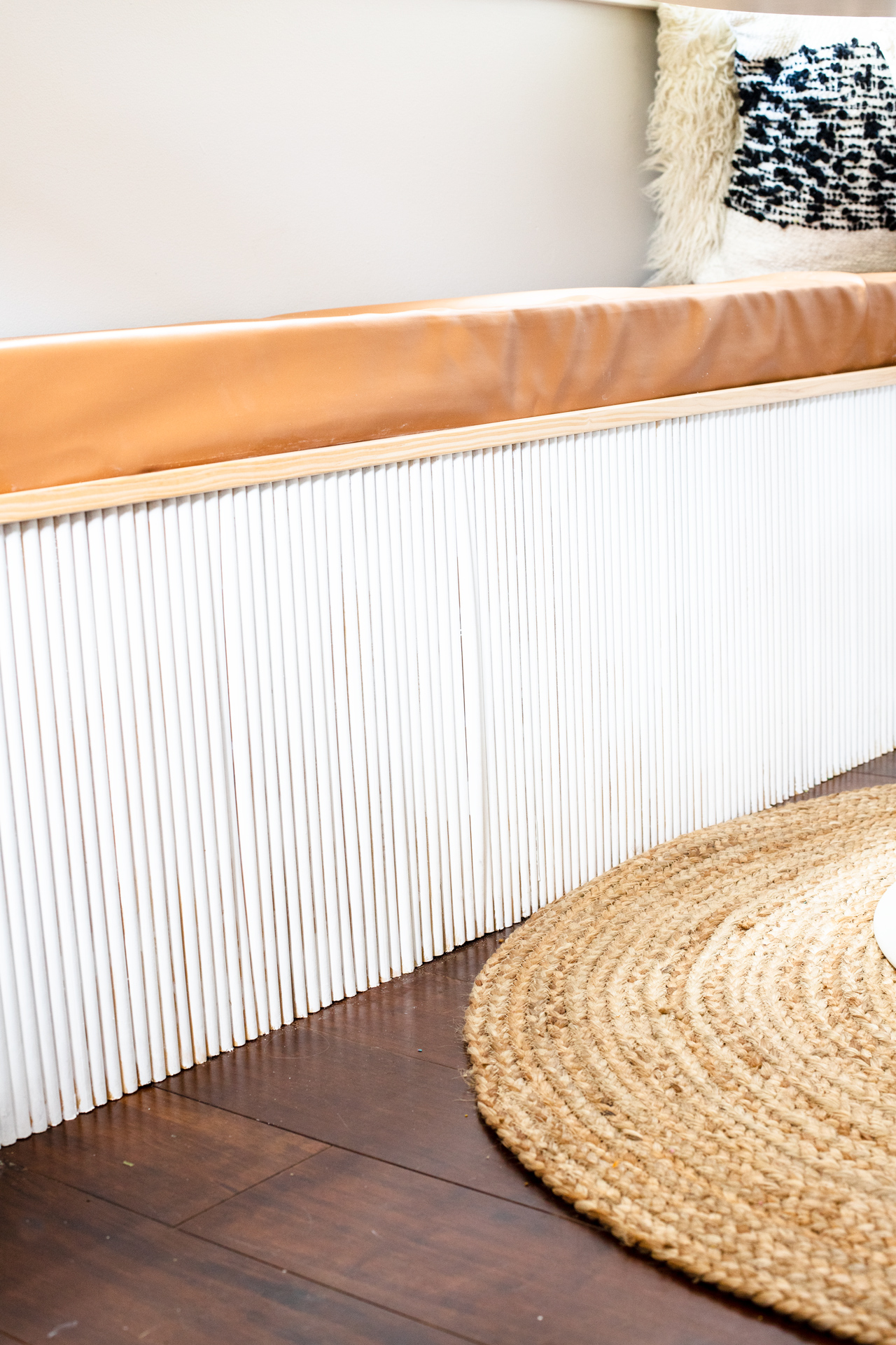 Luckily, I had built a banquette in our old house, using two Ikea cabinets that I figured I could repurpose. I knew they would work, but I really didn’t love how I upholstered the fronts with the faux leather and I wanted go to with fluted look. So I brainstormed and came up with this design.