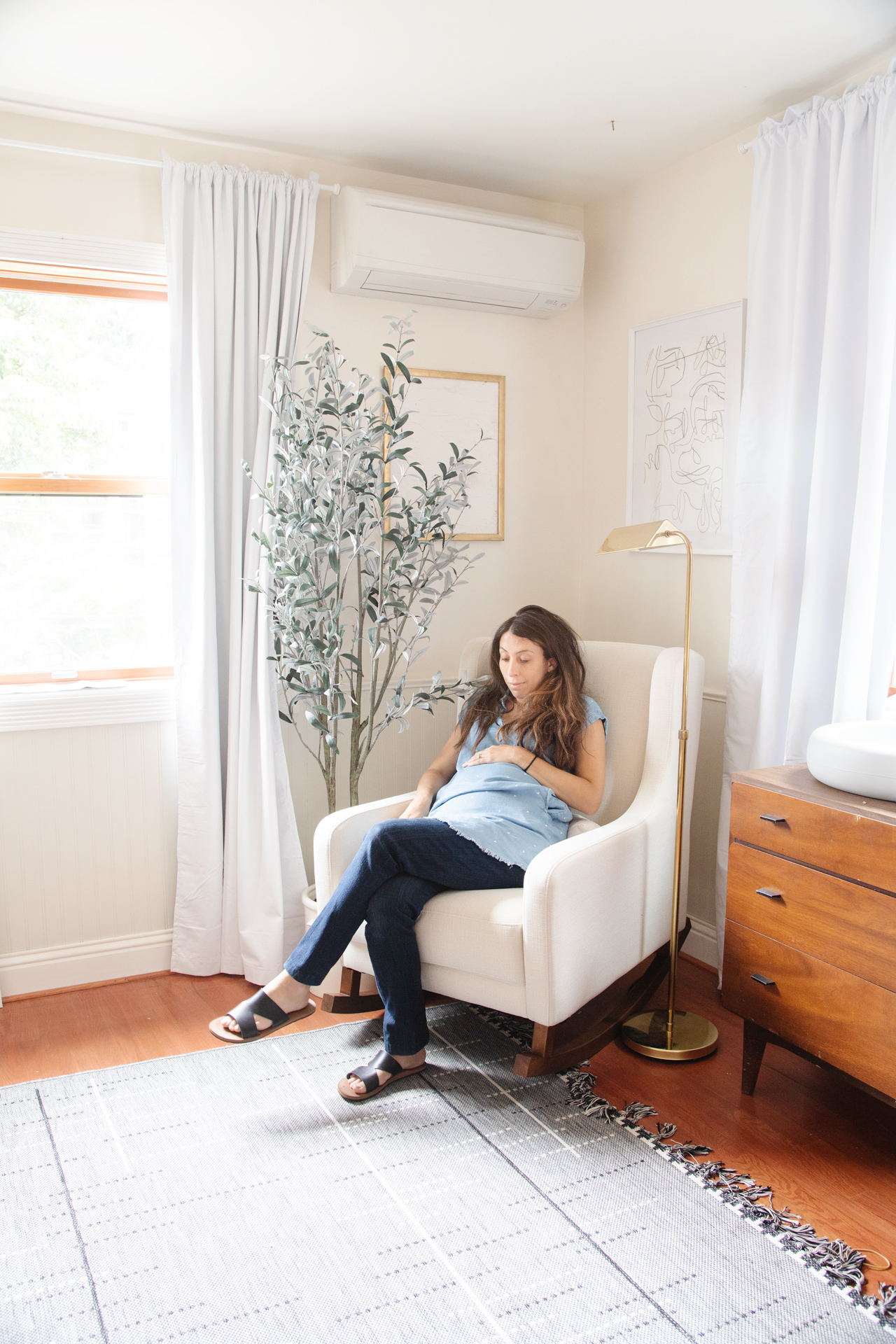 We’ve been in our house for just under 2 months and I’m not due until December, but I knew that getting the nursery ready was something that I couldn’t put off too long. I had so much fun decorating Florence’s nursery, but it was also really stressful. I decided that this time around, I would take my time and not stress so much about making things perfect.ย So that’s why I got started early. So far, I’ve painted the room a creamy white, hung new curtains, got a beautiful rocker and a faux tree, and had Joey make artwork.ย If you can’t tell, I’m going for neutral as the theme. Shocking right? My mom asked me what colors I was doing and I said, “beige, white and maybe some gray” – she was less enthused about my design, but I am who I am.ย I’ll do a full post with sources once I get everything ready, but wanted to share a sneak peak.