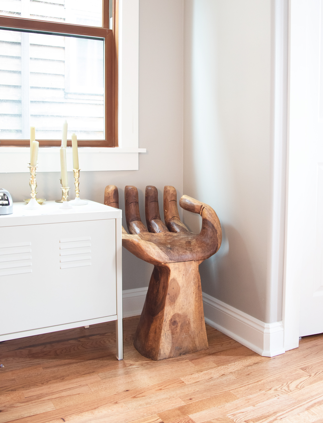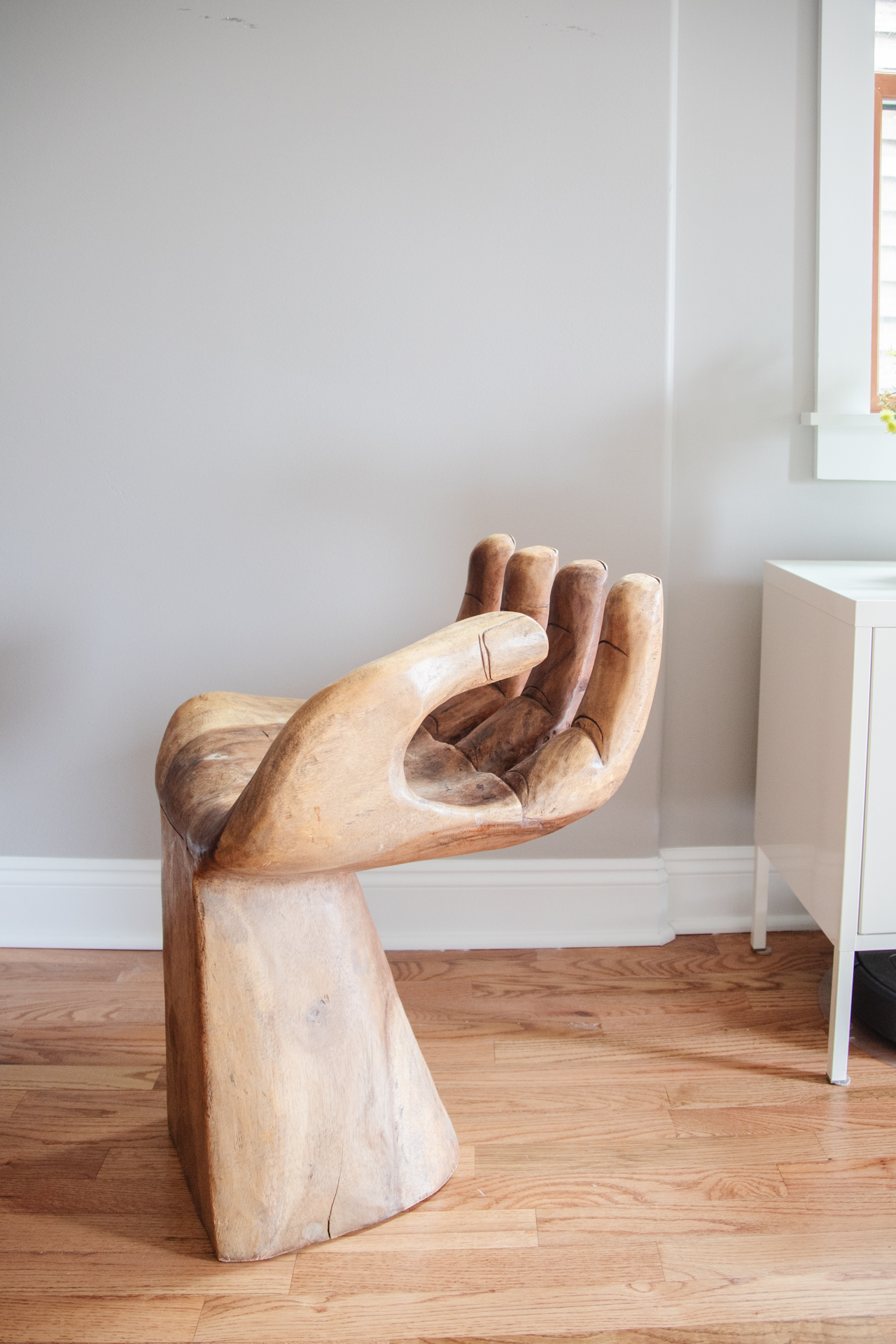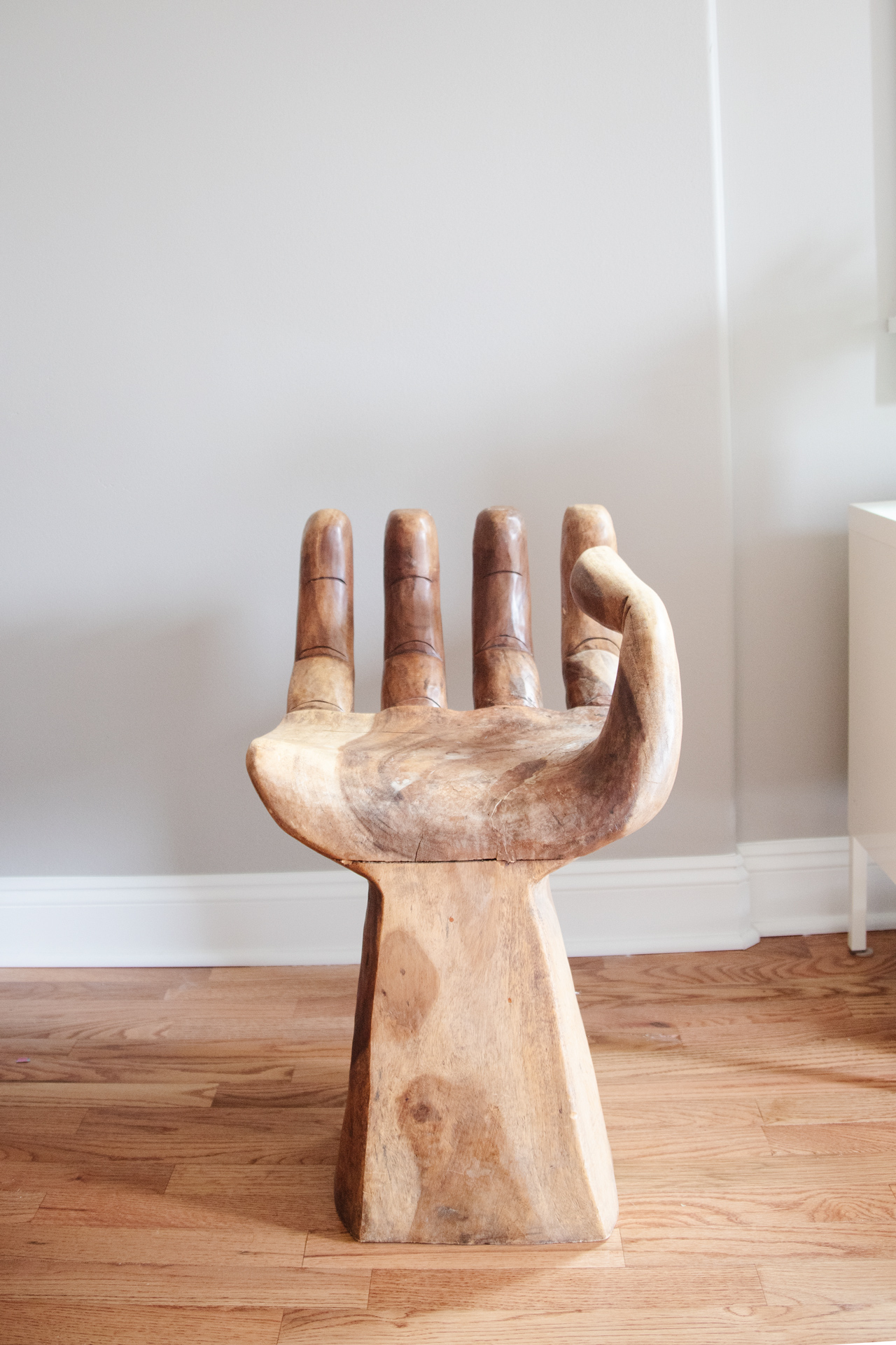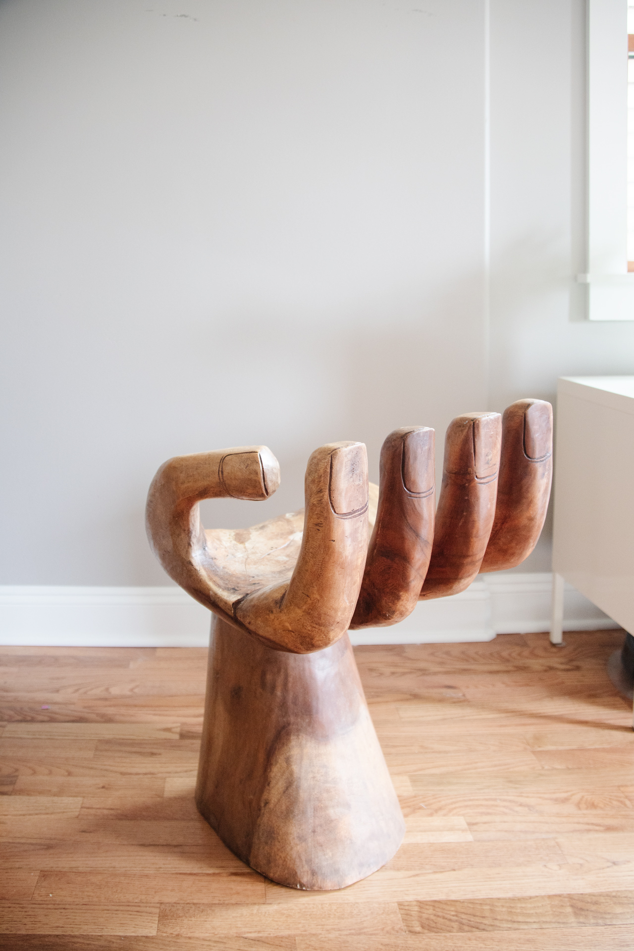 A few weeks ago, I went antique shopping with a friend. It was one of my first outings without Florence and Nico, and my mission was simple… find some dining room chairs. I didn’t succeed, but I did end up stumbling on an amazing chair shaped like a hand. I had no major use for it, but I couldn’t get it out of my head. So a few weeks later, I dragged the whole family to check it out once more. (Side note: taking a 4 year old and baby to an antique store is anxiety inducing – I like to live on the edge). After some deliberation, Joey agreed that we had to have the hand chair. It’s weird, unique and totally on brand for us. The price tag was $910, which is hefty for us, but worth it since it’s from the 1960s and is a total statement piece.