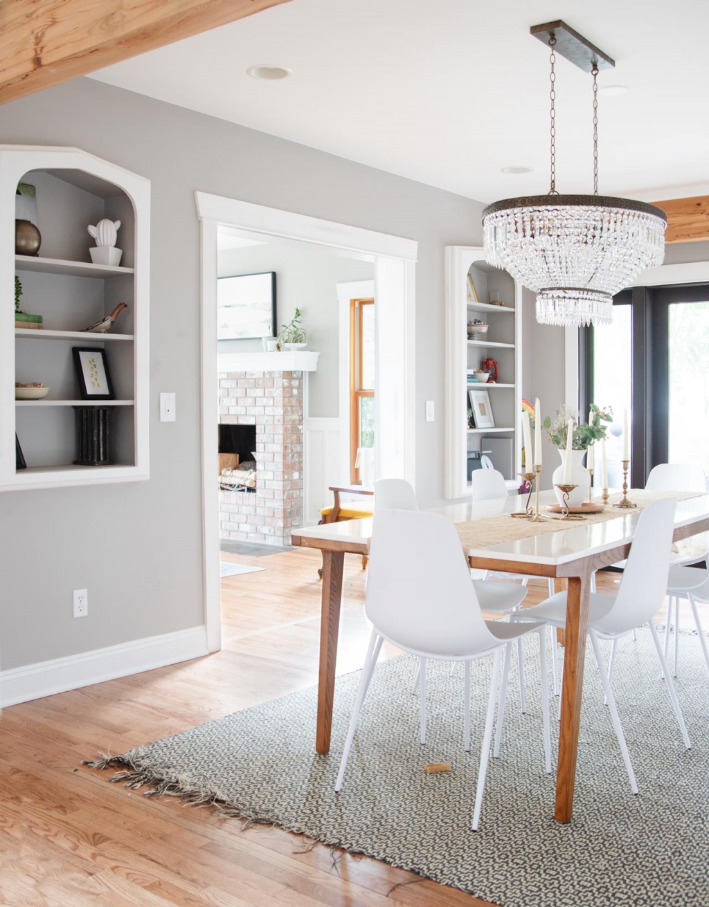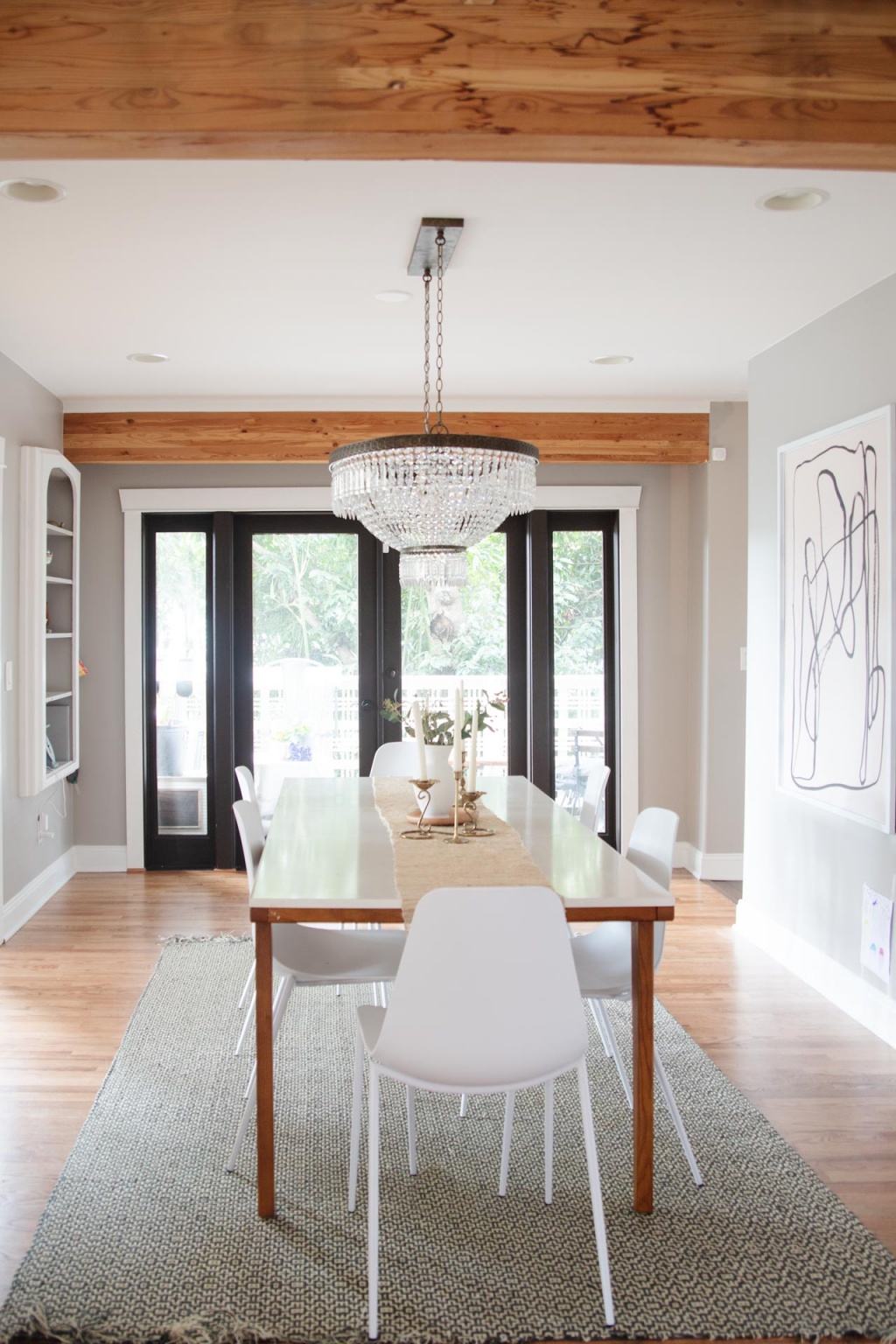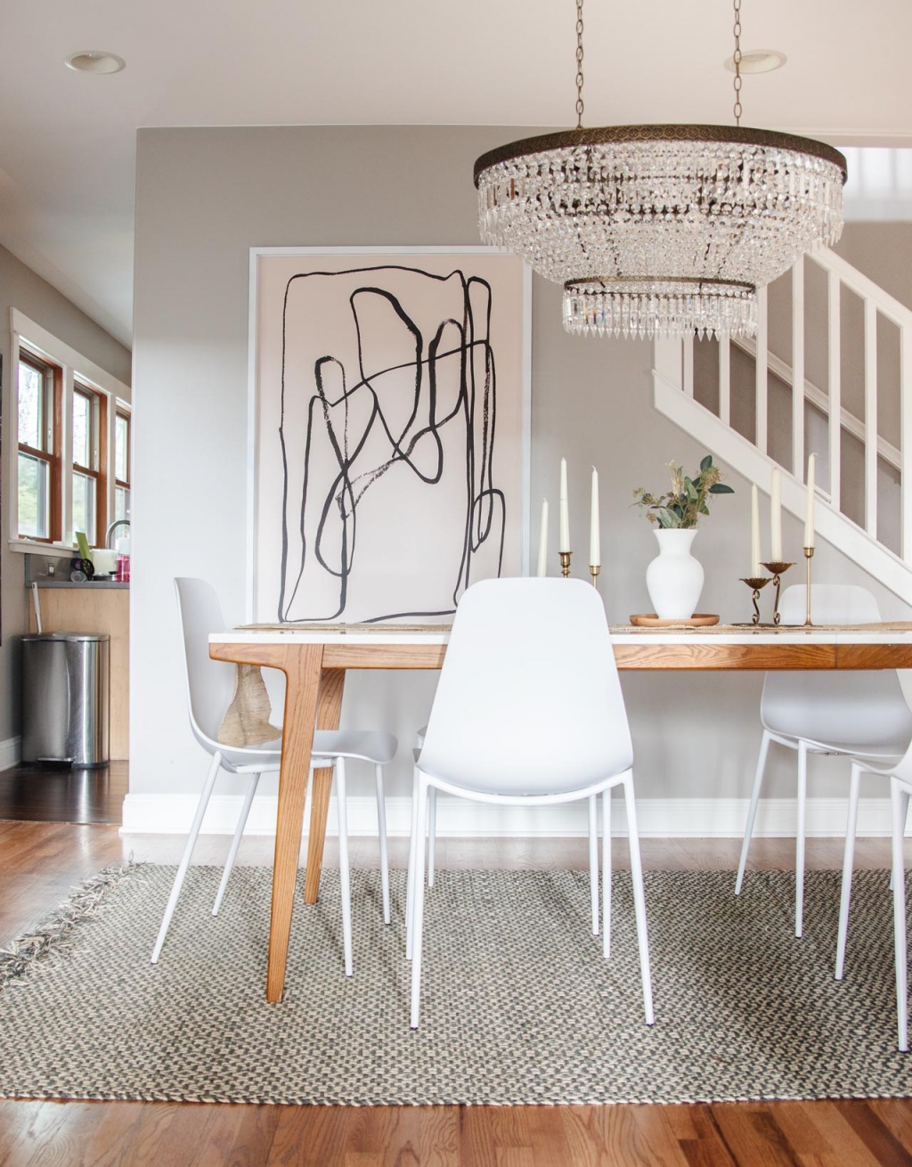 The design all started with a Pottery Barn Chandelier (Scarlett Crystal Oval Chandelier) that has major antique french country vibes. I loved the look of the chandelier, but it didn’t really go with our schoolhouse style chairs. I spent months trying to figure out what type of chairs to buy and was prepared to pay a lot of money, but I happened upon the perfect chairs at a local furniture shop (Ballard Consignment) for a bargain price. They are the Svelti Pure White Dining Chairs from Article. Ballard Consignment has some type of deal with Article where they get customer returns and can sell them as second hand, which is such a cool program. The chairs made a big difference, but I think my favorite addition to the room is some oversized artwork from Juniper Print Shop. It’s Trails by Candace Wiant. I got the 45×55 size and I used an IKEA Bjorksta frame, which I spray painted white. It’s a super inexpensive way to get oversized art that looks like a million bucks.