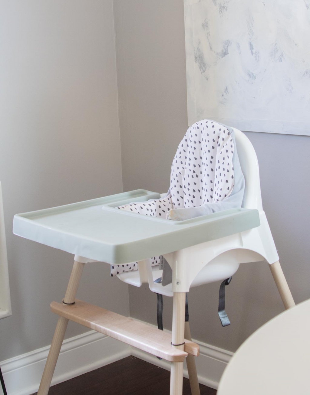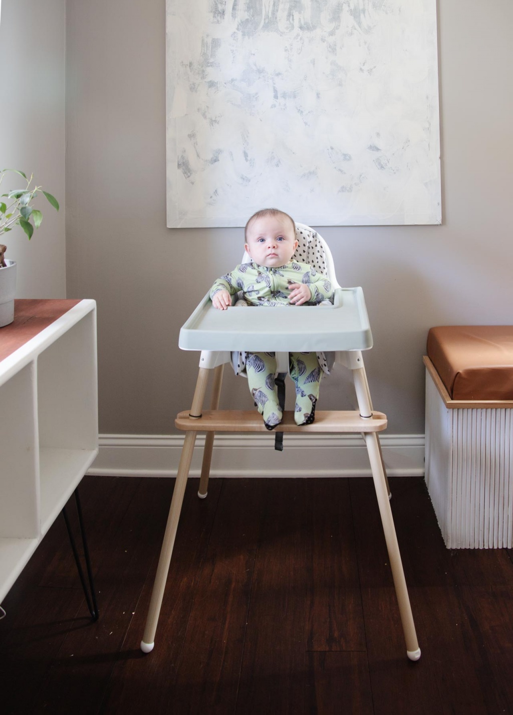 Don’t be fooled by Nico’s grumpy face above. So far, he is loving it. He likes being at table height, and I love having such a cute high chair. Super simple and pretty affordable. Winner, winner, chicken dinner.