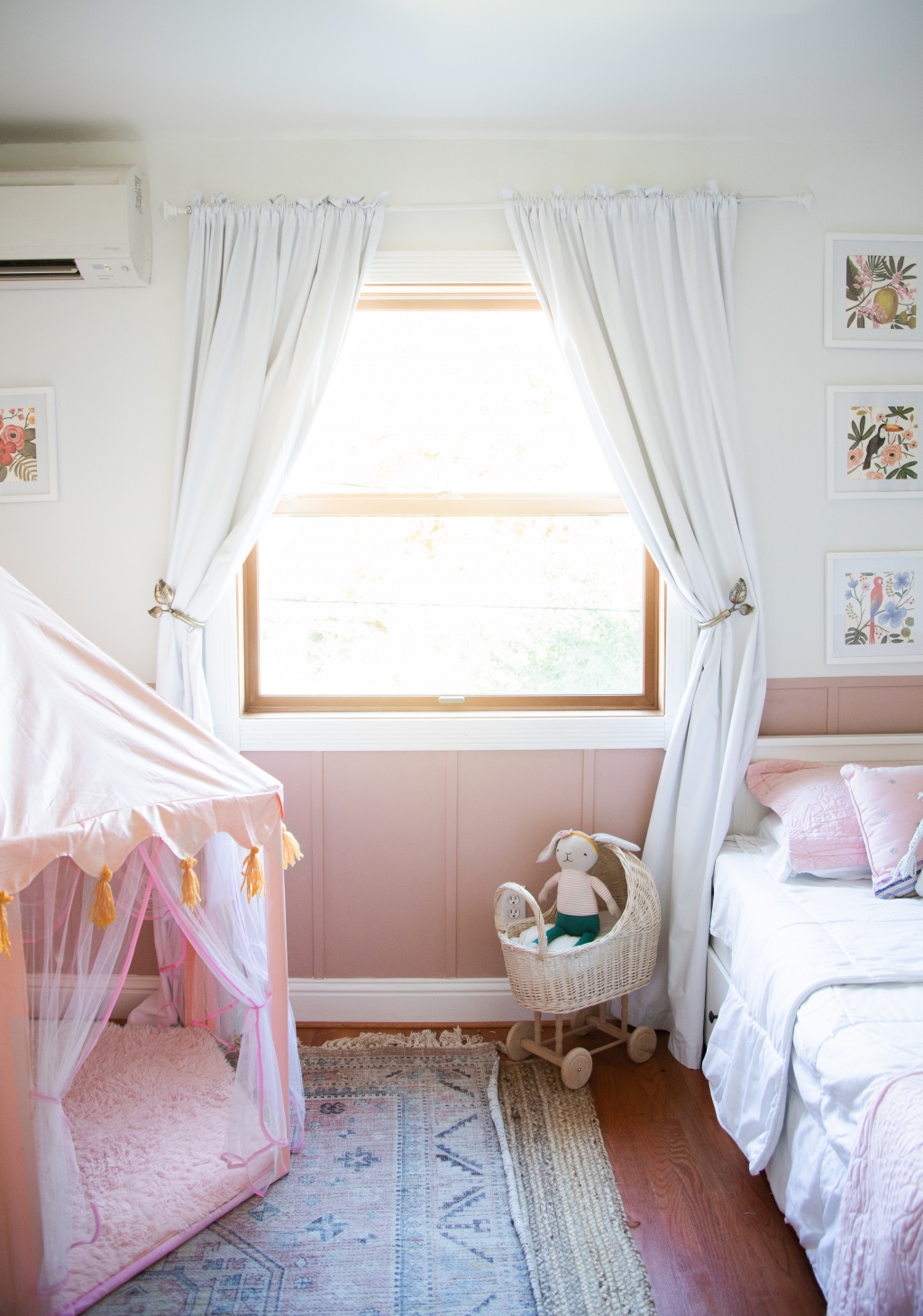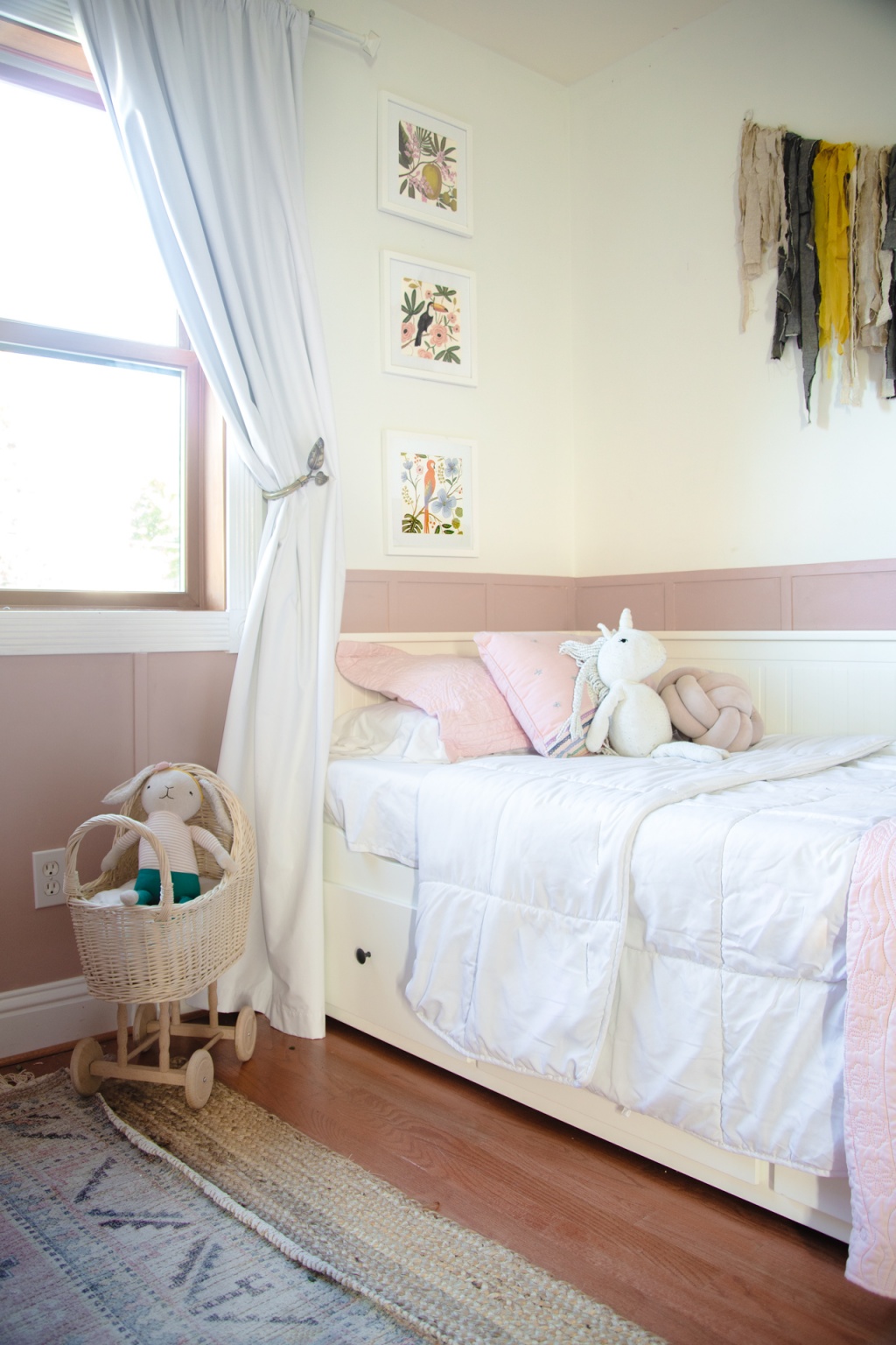 When I was finally done with the room, Florence’s reaction was perfect. She said “I love it, but it could use some more unicorns.” So I think one of my next missions is to find some unicorn artwork to replace the bird and flower pictures, which are actually just pages from a Rifle Paper Co calendar that I framed.