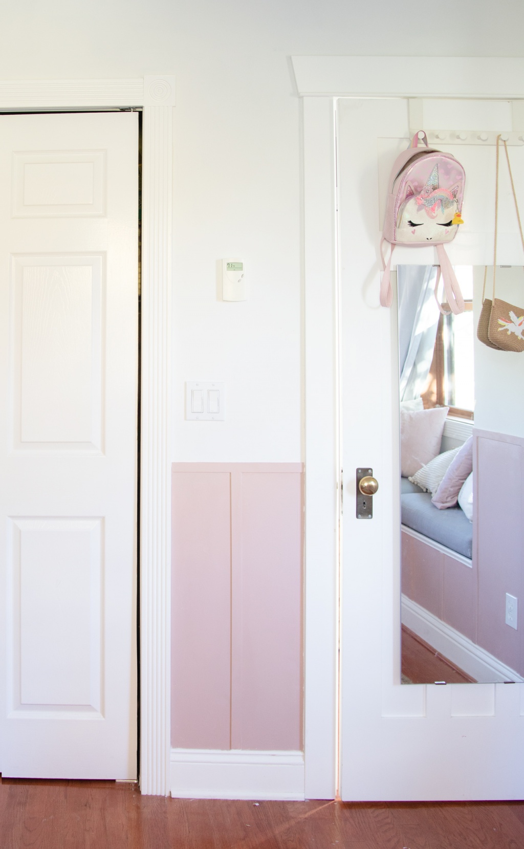 To start, I tested out about 10 different variations of pink. I finally landed on Behr Vintage Tea Rose, which is a slightly purple, very muted version of pink. It seemed to be the best fit for all the other pink accessories she has going on in the room (pink rug, quilt, pillows, etc.). But I knew that having the whole room pink would be a bit overwhelming, so I decided to do a board and batten DIY and just paint the lower half. Because I didn’t want to use power tools, and I didn’t want to remove our baseboards, I went with 1 inch lattice strips. They are super inexpensive, easy to cut with a hand saw, and are thin enough to work with our existing baseboards.