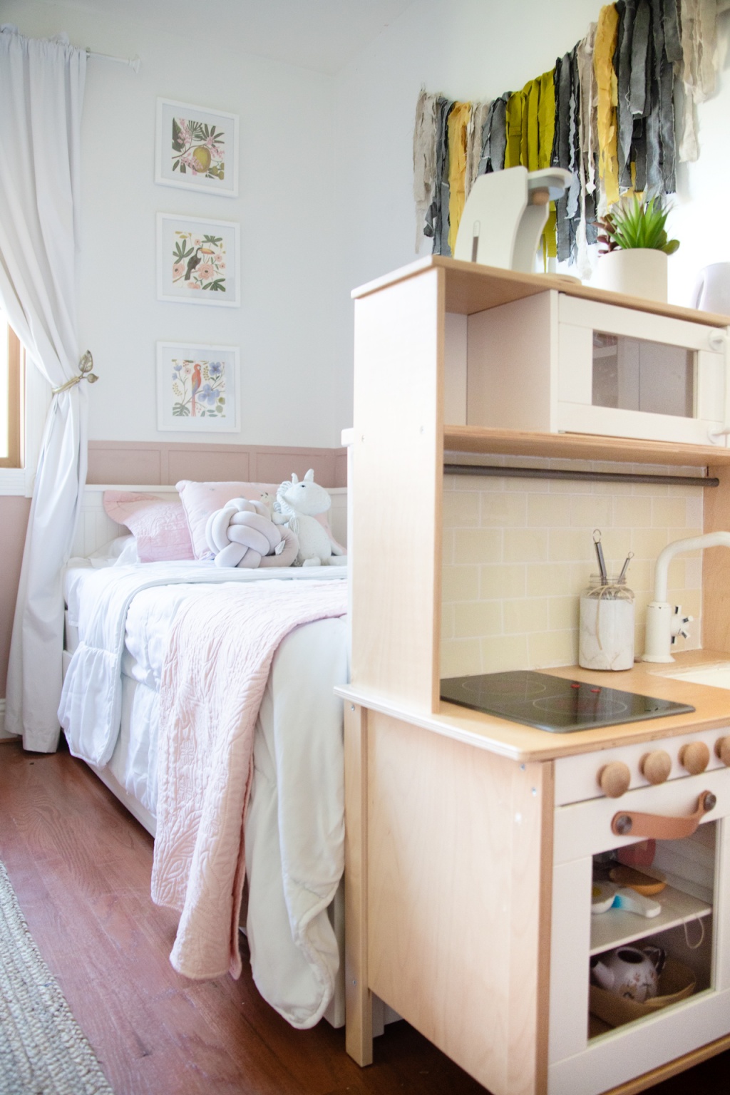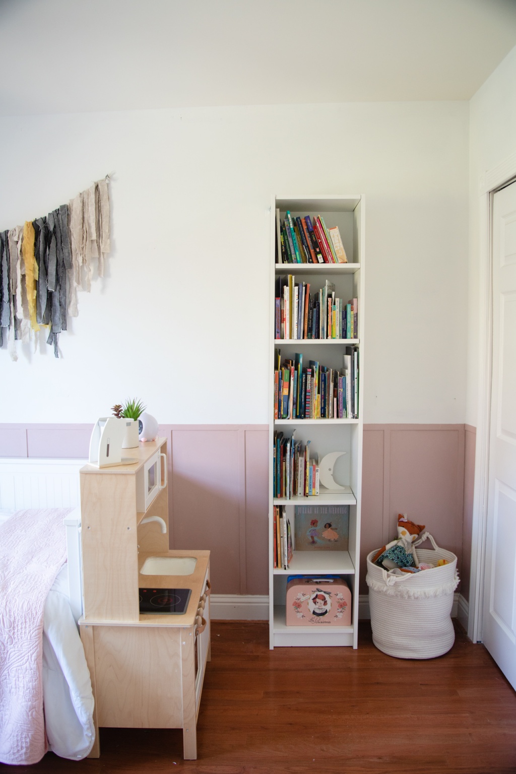 I took the opportunity to do some rearranging in her room because I wasn’t really feeling the flow. I ended up putting her play kitchen at the end of her bed, which created a fun little nook next to her bookshelf. And you might recognize the fabric wall hanging above her bed. That’s made an appearance in 3 of our homes. It’s pretty versatile.