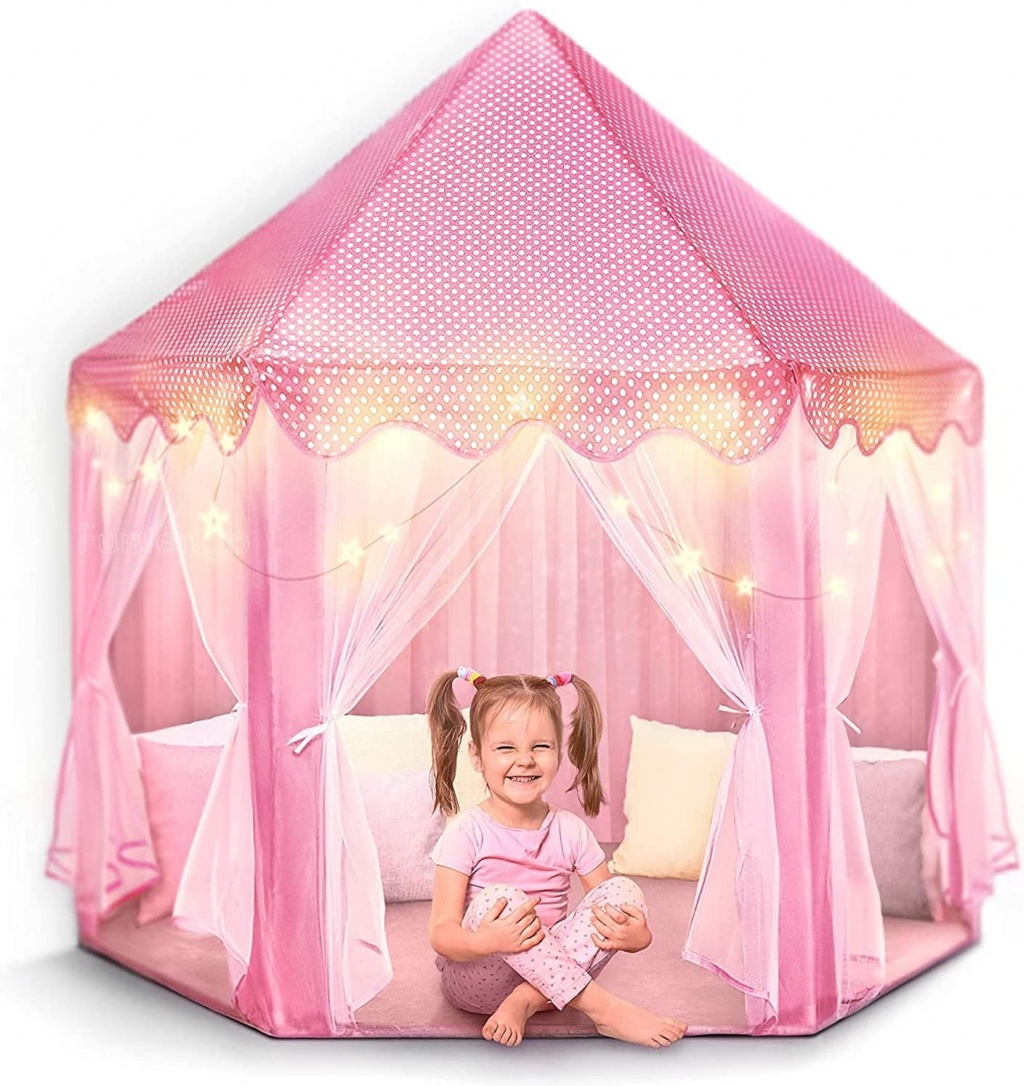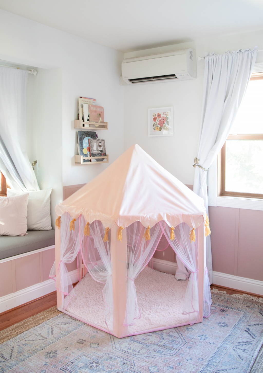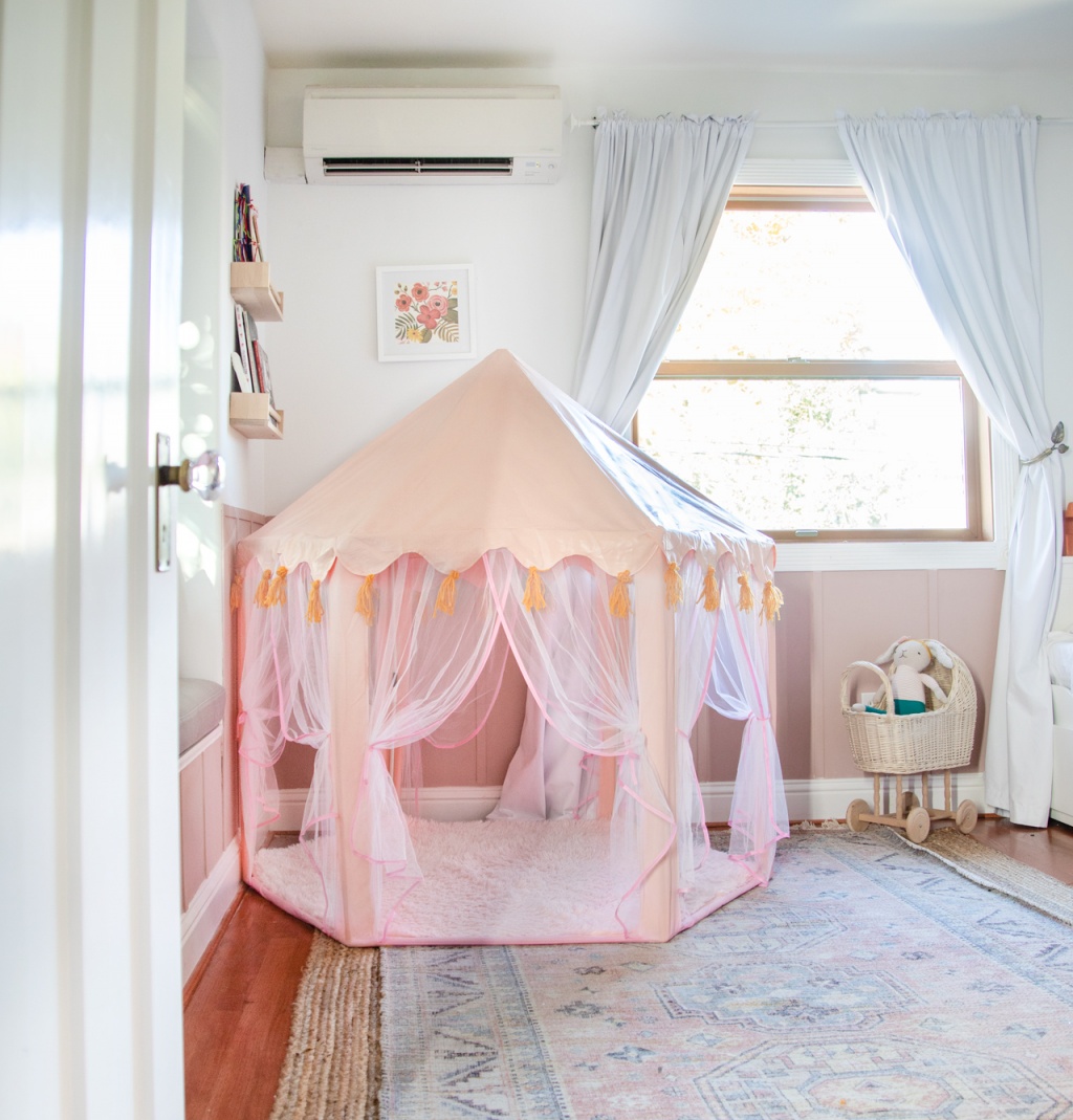 Last year, Florence got a princess tent for Christmas, and it’s probably her favorite gift that she has ever received. It was bright pink, had polka dots, and was very big. What’s not to love? If you are a 5 year old girl, it’s a dream, but as far as I was concerned, it was a bit of an eyesore. I tried to convince her to replace it with a more color neutral playhouse, but she wasn’t having it. Go pink or go home is her motto. Here is the exact tent so you can get a feel for what I was dealing with…