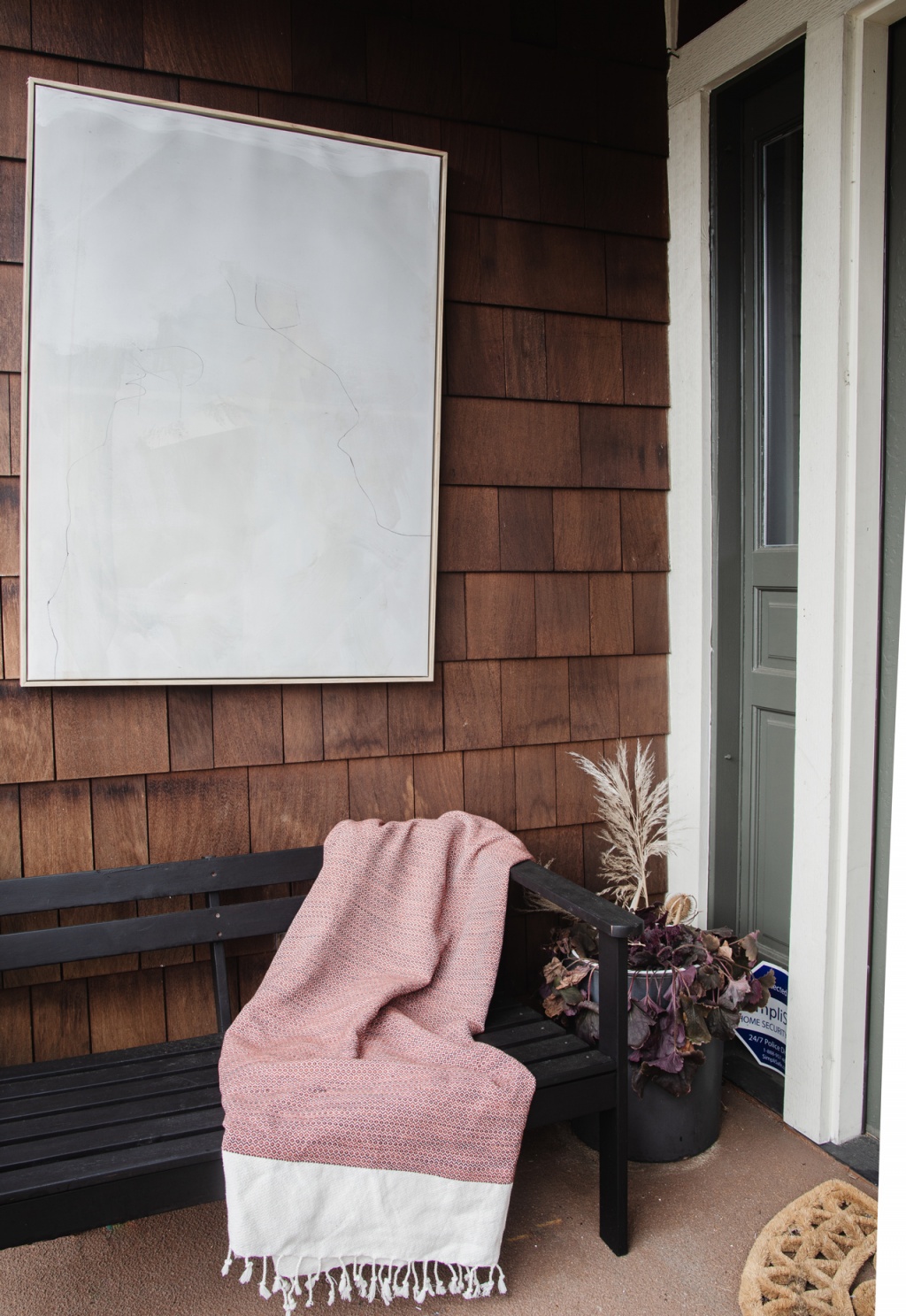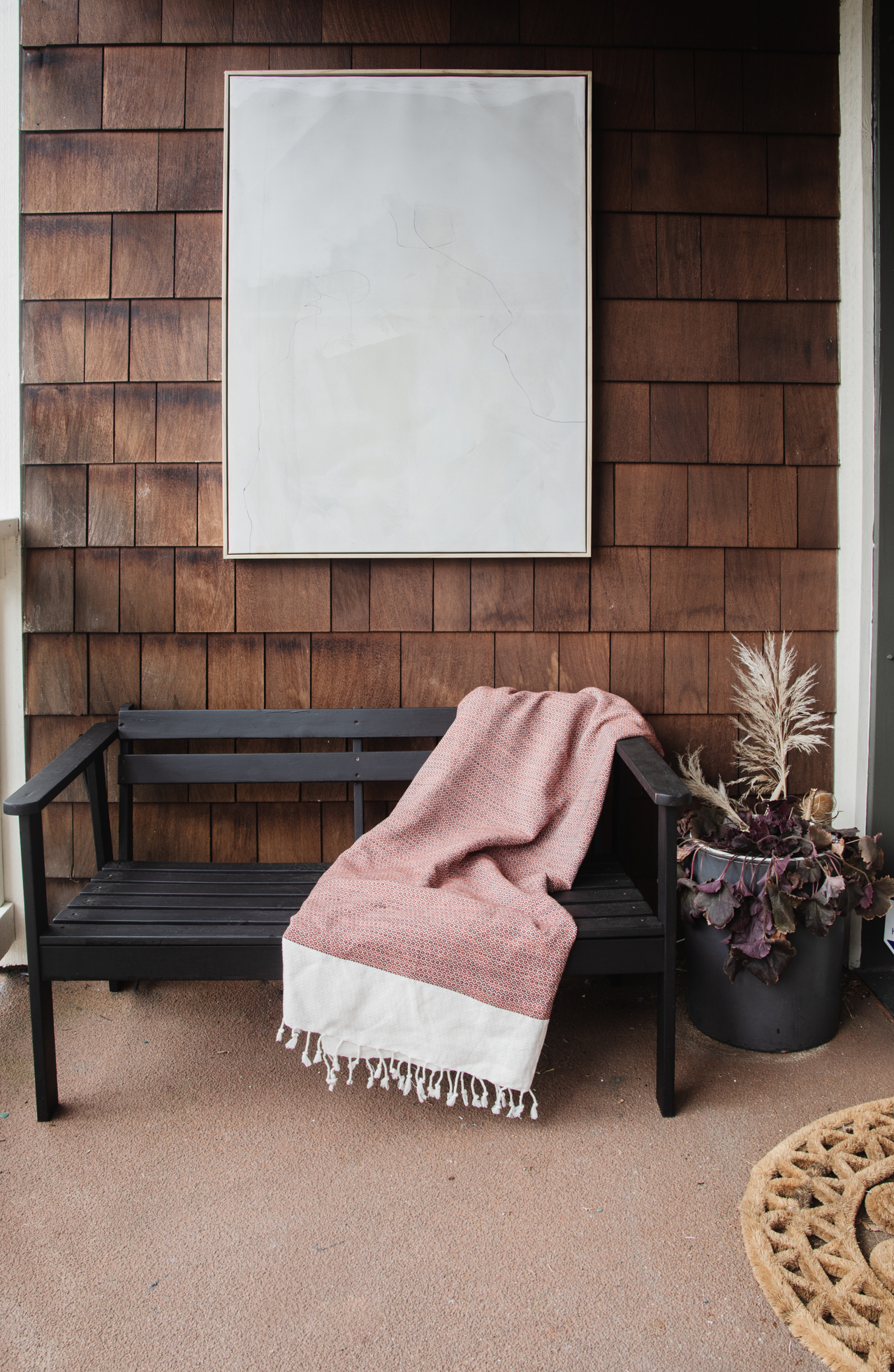It totally elevates our front porch game. Because our porch is covered, I was also able to hang some art, which looks so great. The art was a free find on Offer Up, and Joey sprayed the canvas with a clear coat to make it a bit more weather durable. If it ends up getting ruined after a few years, I’m not going to be too upset since it was free! Also, please don’t judge my sad planter. I know the poor plant looks like it’s on death’s doorstep. I have no excuse.