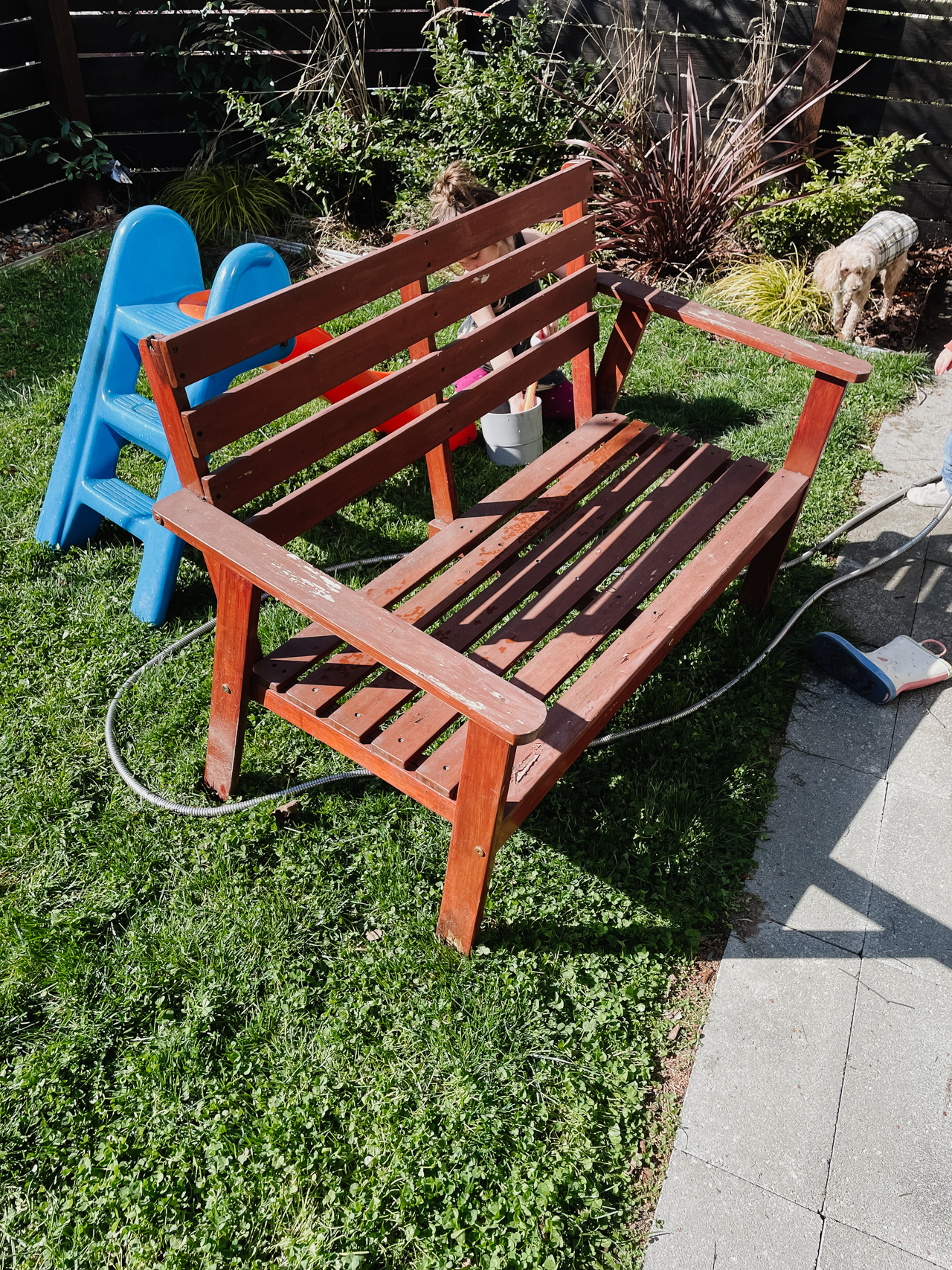 It was in such a sad state that I figured I might as well go wild and experiment with the design. If it looked terrible, I could just put it back on the curb for someone else to upcycle. So I used my circular saw and started cutting. First I cut the legs down so they were even. Then I decided to cut the back. I took off 2 of the horizontal bars and made the bench end at the top of the arms. After that, I did a thorough sanding and used some black stain that we had leftover from another project. My hopes were low, but wow, this was such a glow up.